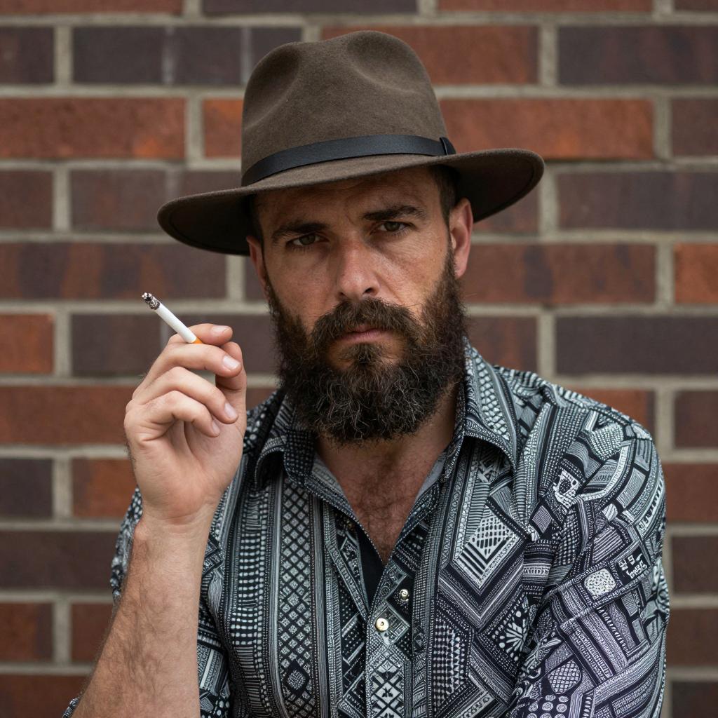 Close-up photograph of a man with light skin, brown eyes, and a dark brown hat with a wide brim. He has a slight beard and a cigarette in his mouth. He wears a gray, knitted scarf wrapped around his neck. The background is blurred and dark. His expression is intense, with slightly parted lips and focused eyes.