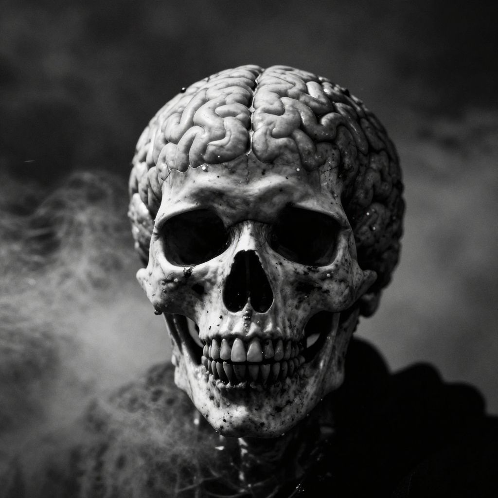 Photorealistic, black-and-white image of a detailed skull with visible brain texture, surrounded by eerie smoke, creating a haunting, ghostly effect.
