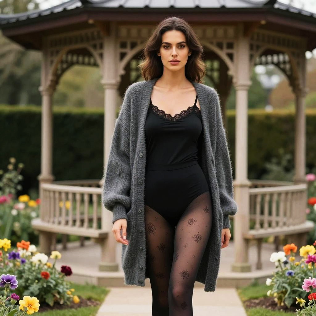 A tall woman in casual streetwear, wearing an oversized charcoal grey cardigan over a lace-trimmed black camisole and patterned sheer black tights, stands in a flower garden by a charming gazebo, captured in a vibrant visual style. Sexy. Pretty face and beutiful eyes