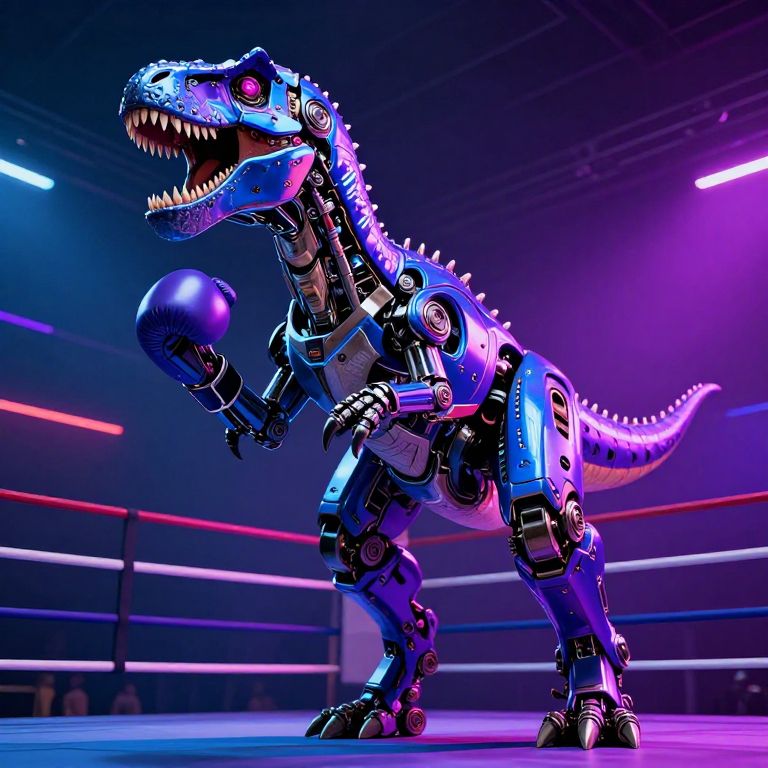 In this vibrant and dynamic scene, a robotic dinosaur, with its intricate mechanical anatomy, stands triumphantly on a boxing ring. The creature's body is a striking blend of blue and purple hues, with glowing neon lights illuminating its form, casting an otherworldly glow. Its powerful limbs and tail are adorned with metallic accents, adding to its imposing presence. The dinosaur's head is a fierce expression of robotic engineering, with sharp teeth and a menacing gaze. In its left paw, it holds a boxing glove, a symbol of its readiness for battle. The background is a dramatic mix of dark and neon colors, with streaks of light creating a cinematic atmosphere. The overall composition is a striking juxtaposition of ancient and futuristic elements, creating a visually captivating and surreal scene.