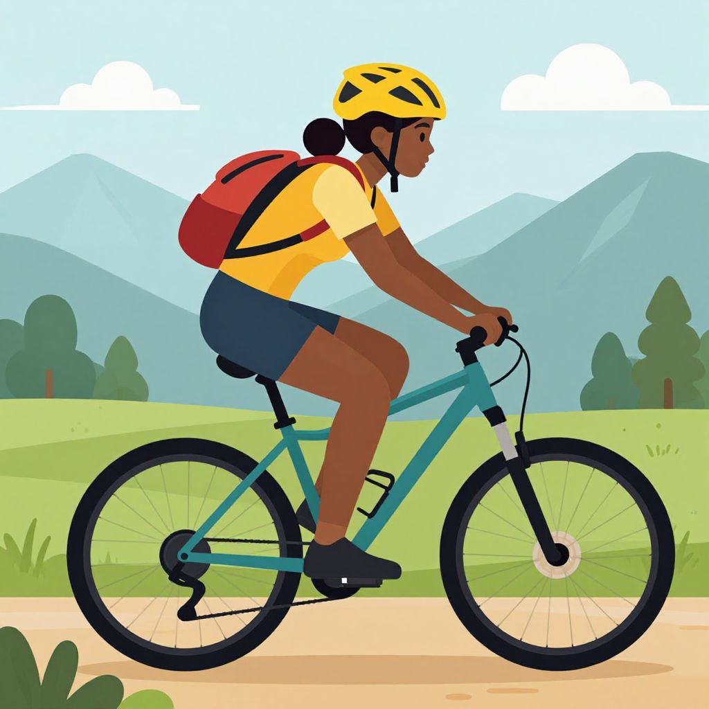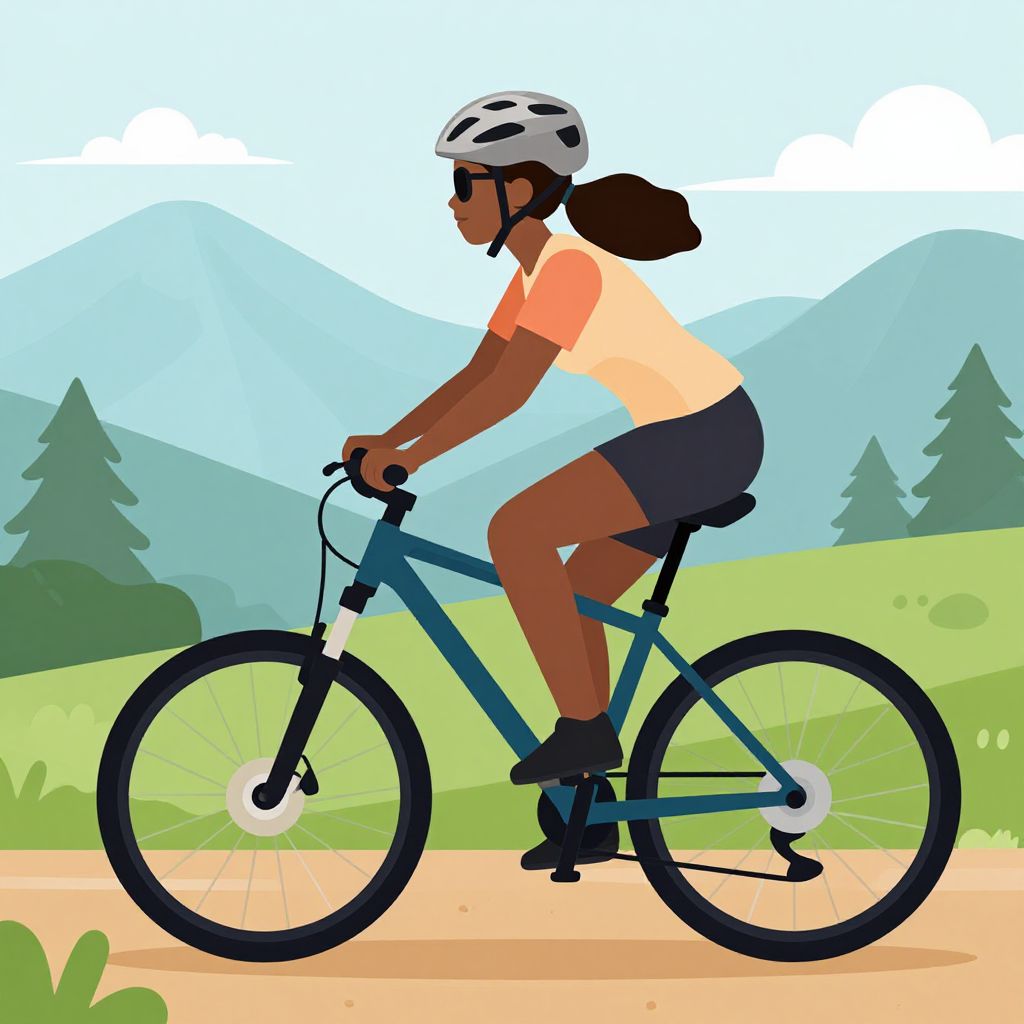 Extreme african-american woman riding on mountain bike. Young confident female tourist in helmet traveling in the mountains on a mountain bicycle. Vector flat design illustration. Square layout.