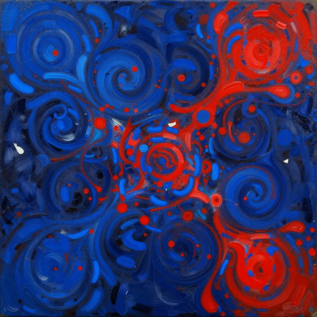 Imagefao abstract expressionist painting, bold swirling patterns of electric blues and fiery reds, chaotic yet harmonious burst of colors and shapes, textured brush strokes creating depth and movement, vivid artistic chaos evoking strong emotions in a digital medium