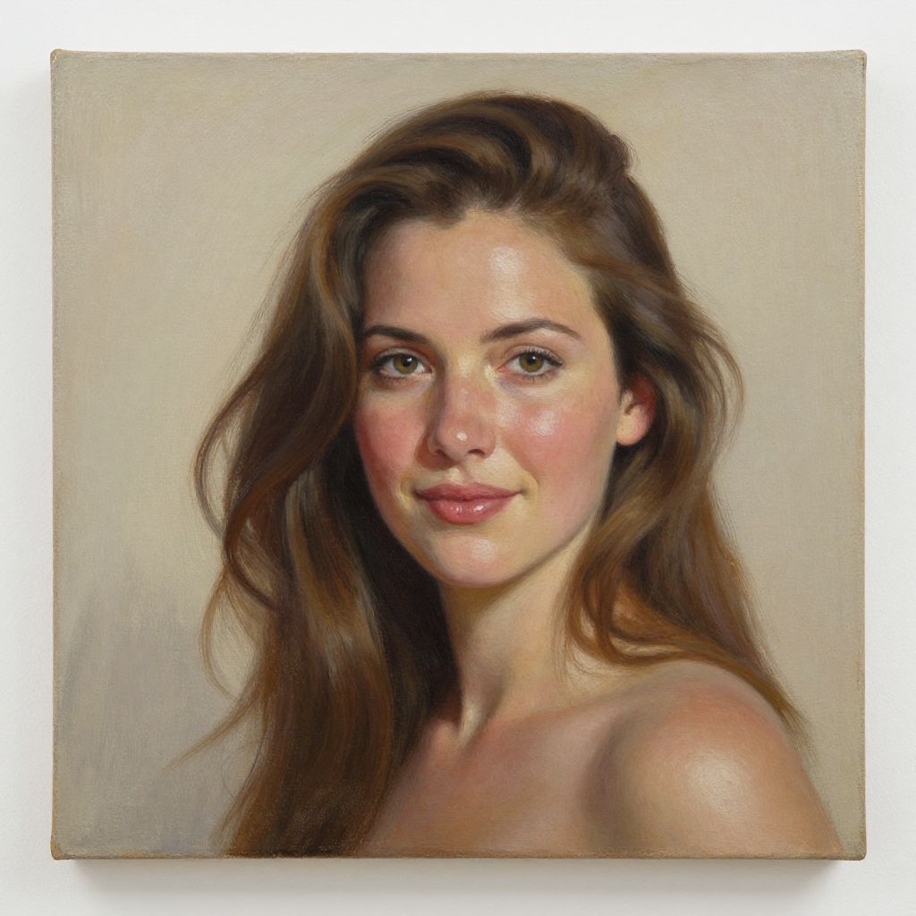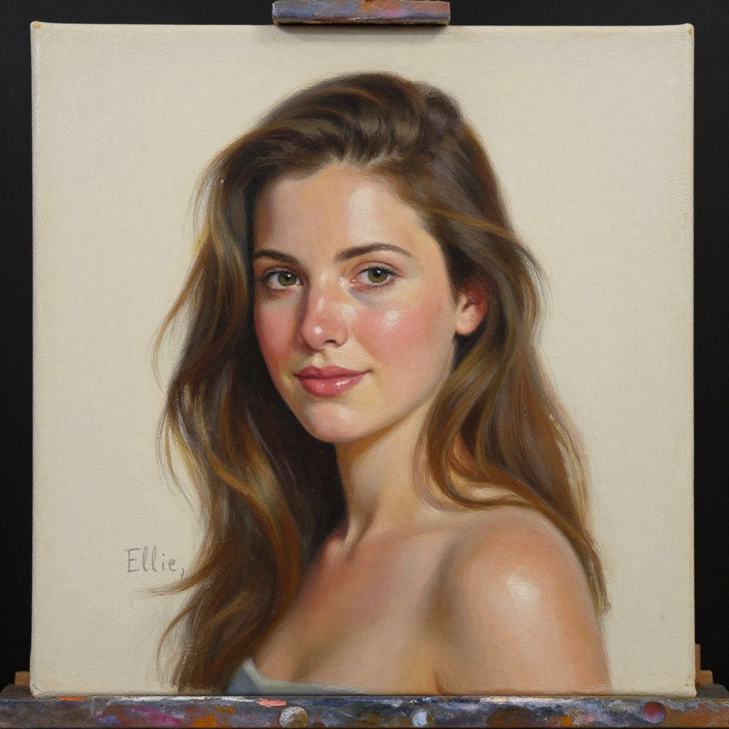 A portrait titled \"Ellie,\" rendered in oil on canvas measuring 12x20 inches, captures a serene and lifelike depiction of a woman with flowing brown hair and a gentle smile, showcasing the artist's mastery of light and texture in a high-definition, realistic style.