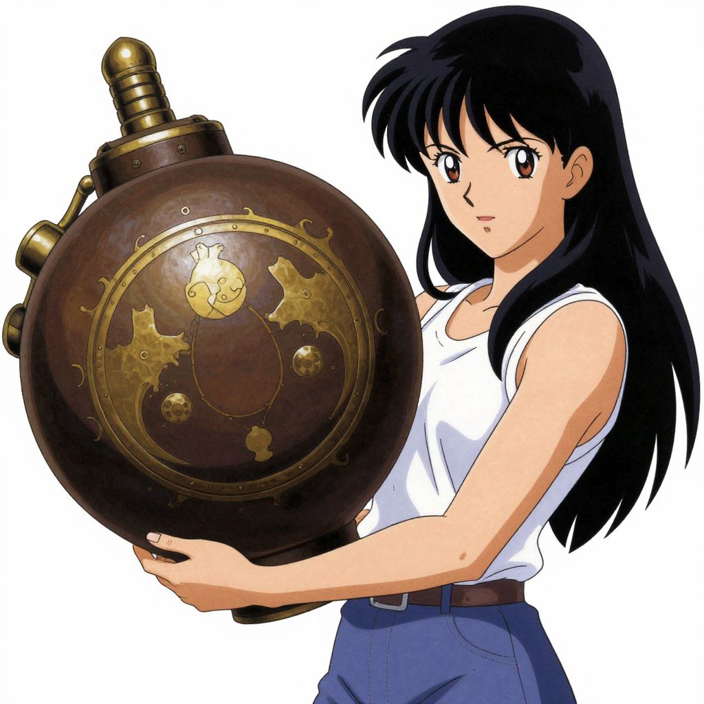 Anime-style drawing of a serious, black-haired girl in a white tank top and blue pants, holding a large, ornate, dark brown shield with