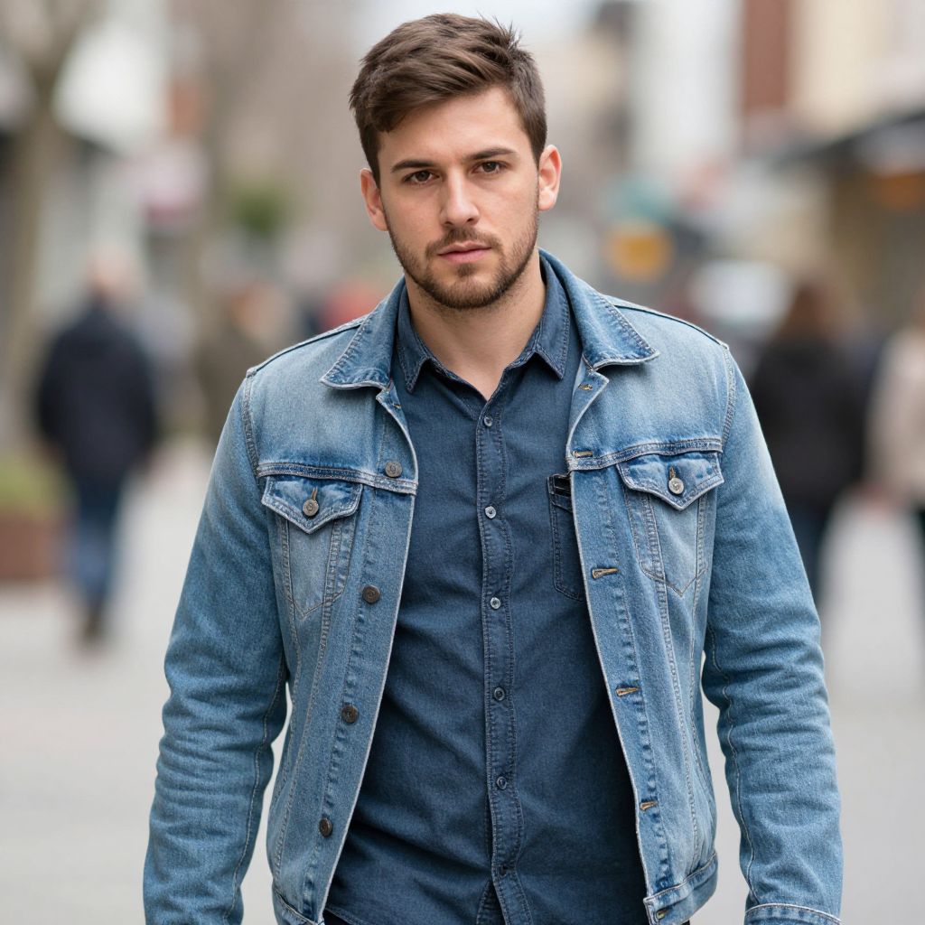 Good casual outfit guy, 1boy, male focus, denim jacket, solo, realistic, jacket, brown hair, denim, looking at viewer, blue jacket, blurry background, upper body, blurry, shirt, facial hair, pocket, bag, open clothes, open jacket