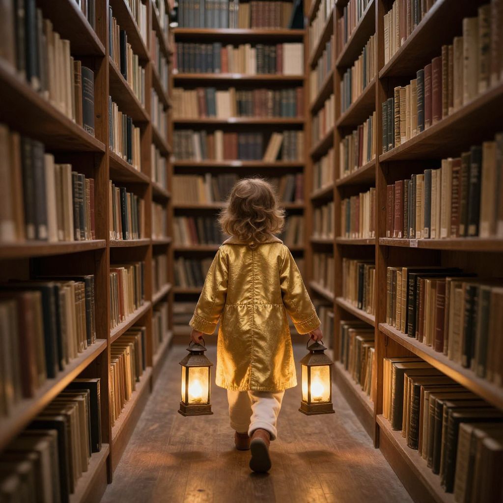 A child in a golden coat, holding twin glowing lanterns, walks through an endless aisle of ancient books, where light dances among the shelves like whispers of forgotten tales reshaping the world with each step.