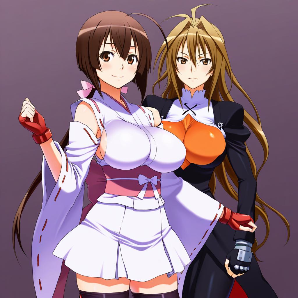 This digital anime-style drawing features two women standing side by side against a gradient purple background. The woman on the left has short brown hair, large breasts, and wears a white, off-shoulder kimono with a red sash, white skirt, and red fingerless gloves. The woman on the right has long, wavy blonde hair, large breasts, and wears a black and white outfit with an orange, form-fitting chest piece, black gloves, and a black skirt. Both women have serious expressions and are positioned slightly facing forward, with the blonde woman's arm around the brown-haired woman's shoulder.