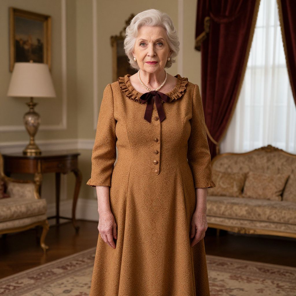 Photograph of an elderly white woman with short, wavy white hair standing in a formal living room. She wears a long, brown, textured dress with three-quarter sleeves and a black ribbon bow at the neckline. Her makeup is subtle, with pink lipstick. The background includes a beige wall, a framed painting, a wooden side table with a lamp, and a patterned sofa with brown and cream cushions. Heavy burgundy curtains partially cover a window, allowing some natural light to filter in. The room has a classic, elegant decor style.