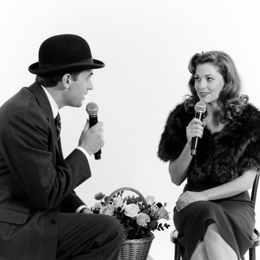 Black and white photograph of a man in a bowler hat and dark suit leaning forward to speak into a microphone, facing a woman with wavy hair in a dark dress and fur stole, seated and holding a microphone, with a basket of flowers on the ground between them. The man looks determined, the woman smiles slightly. The background is white and empty.