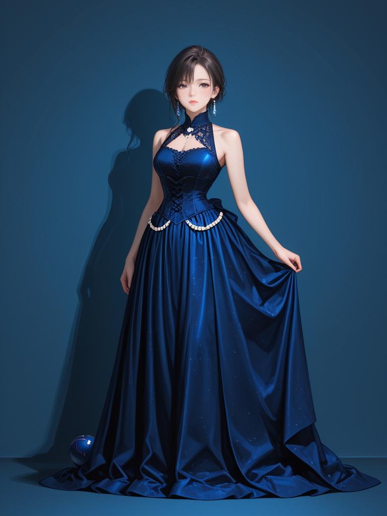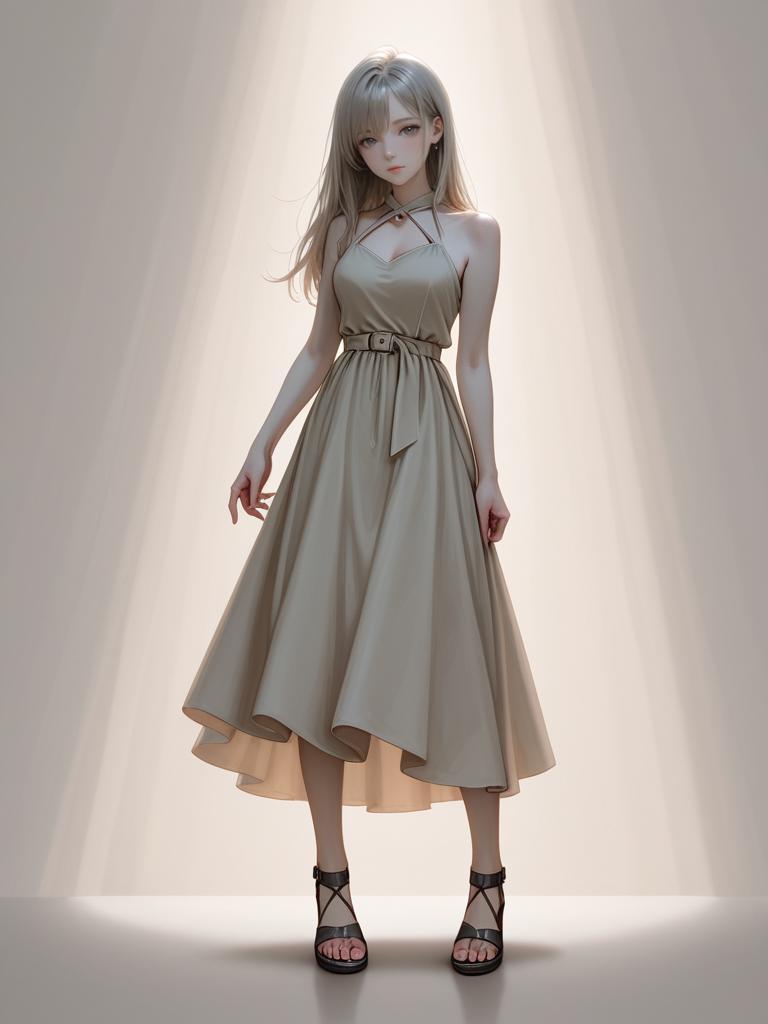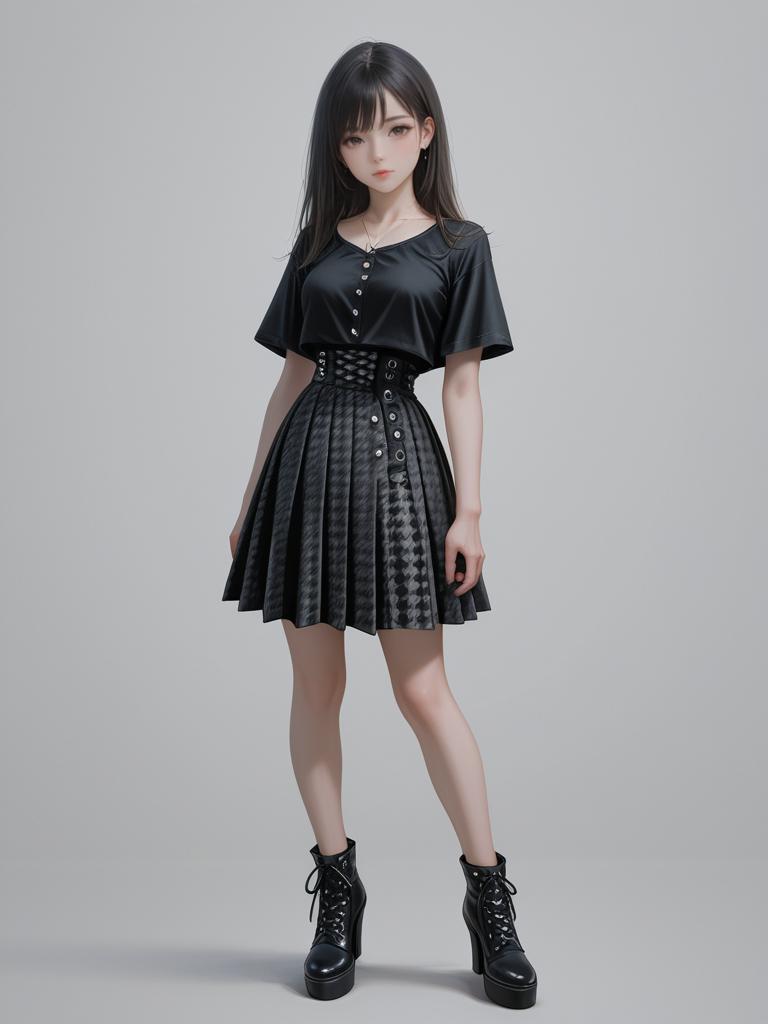 1girl, realistic face, full body shot, Woman, glam rock, sequined mini dress with geometric patterns, short sleeves, round neckline, fitted silhouette, thigh-length, layered chain necklace.
