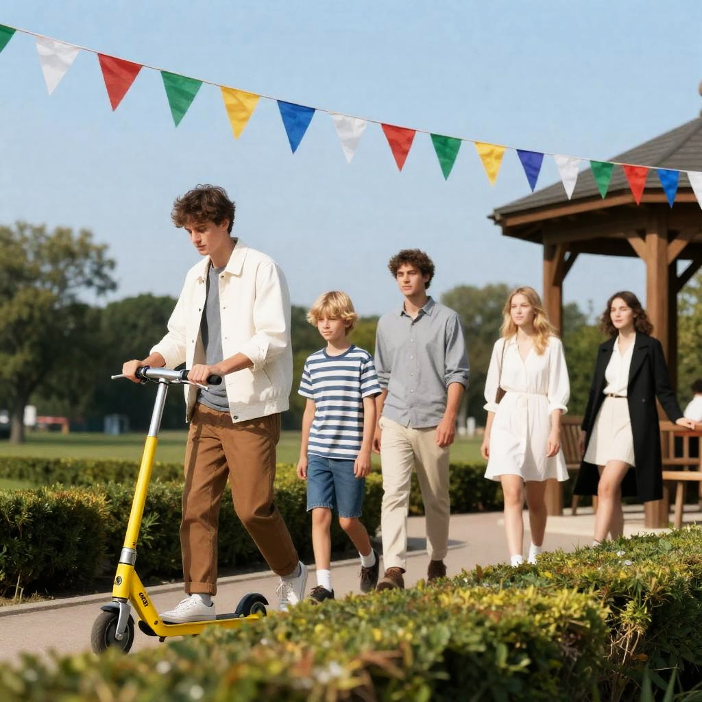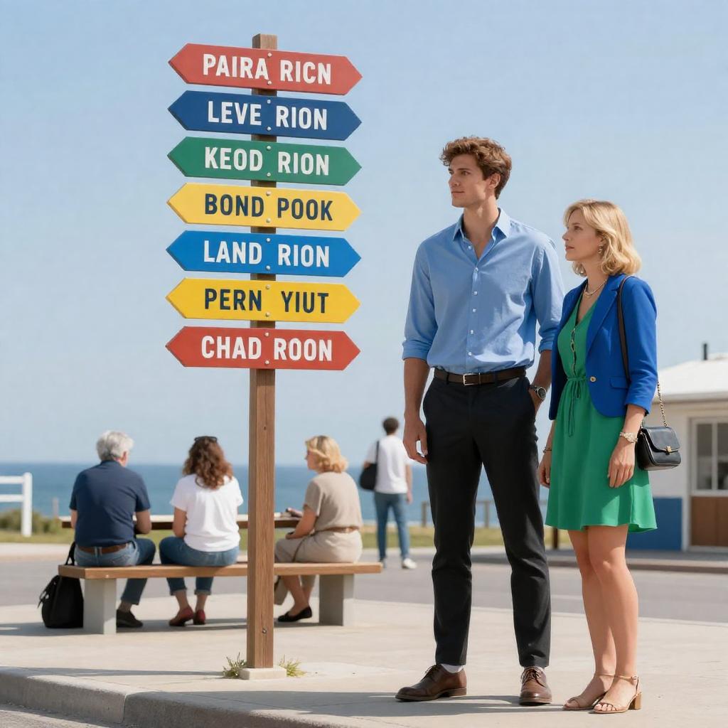 Photograph of a sunny outdoor scene with a wooden signpost in the background. A tall, handsome man in a blue shirt and black pants stands beside a blonde woman in a green dress and blue jacket. Several people sit and stand in the background, with colorful directional signs pointing to various destinations.