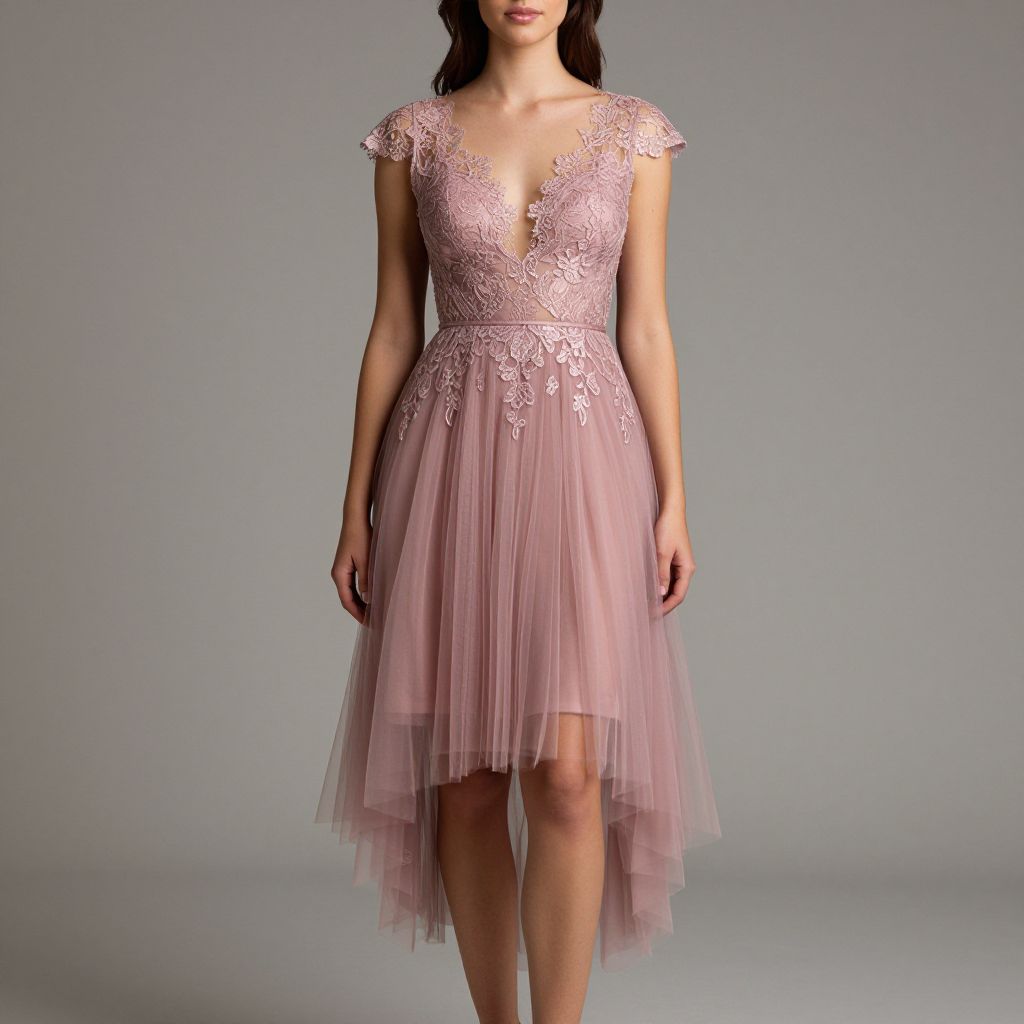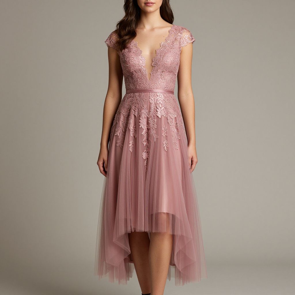 A woman elegantly poses in a 2019 Dusty Pink Tulle Three Quarter Short Prom Dress featuring illusion lace appliqués, showcasing a boho-inspired design with a trendy, high-low silhouette perfect for evening parties and graduations, captured in high-definition detail against a soft, neutral backdrop.