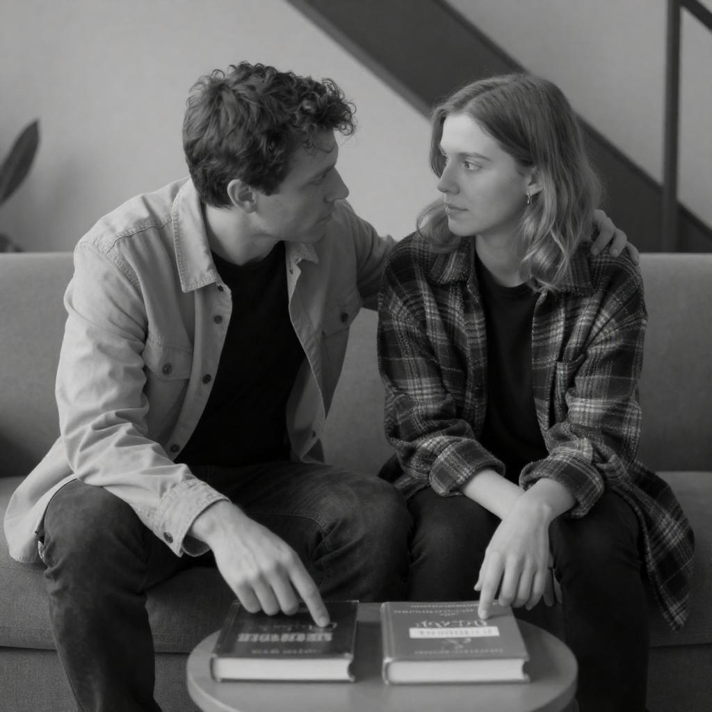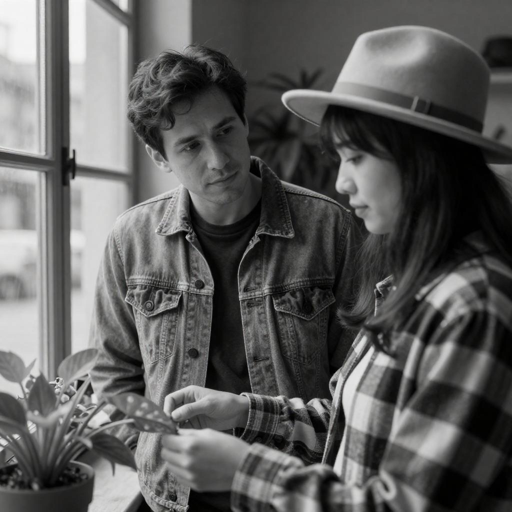 Black-and-white photograph of a man and woman standing near a window with plants. The man has short dark hair and is wearing a denim jacket over a dark shirt. The woman has long hair, is wearing a large hat and a checkered jacket, and is looking down while gently holding plant leaves. Sunlight filters softly through the window, highlighting the intimate moment.