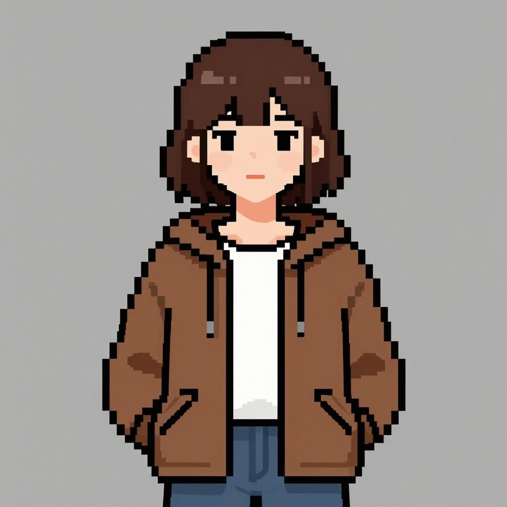 Pixel, pixel art, 1girl, brown short hair, brown hoodless jacket, body