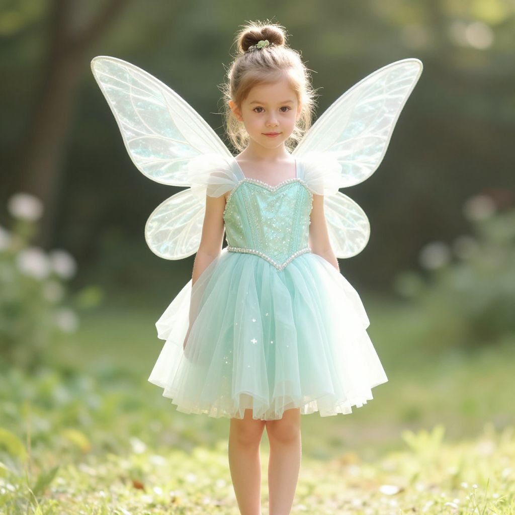 Photograph of a young girl with light skin, brown hair in a bun, wearing a sparkling light blue fairy dress and translucent wings, standing in a