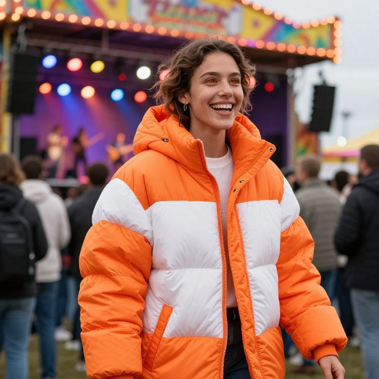 A festival-goer in their early 30s with soft brown skin and warm amber eyes dons a long, oversized puffer coat in bright orange and white, standing on a crowded summer carnival stage, the coat slightly wrinkled from movement, the setting full of colorful lights and music, her face glowing with joy and excitement.
