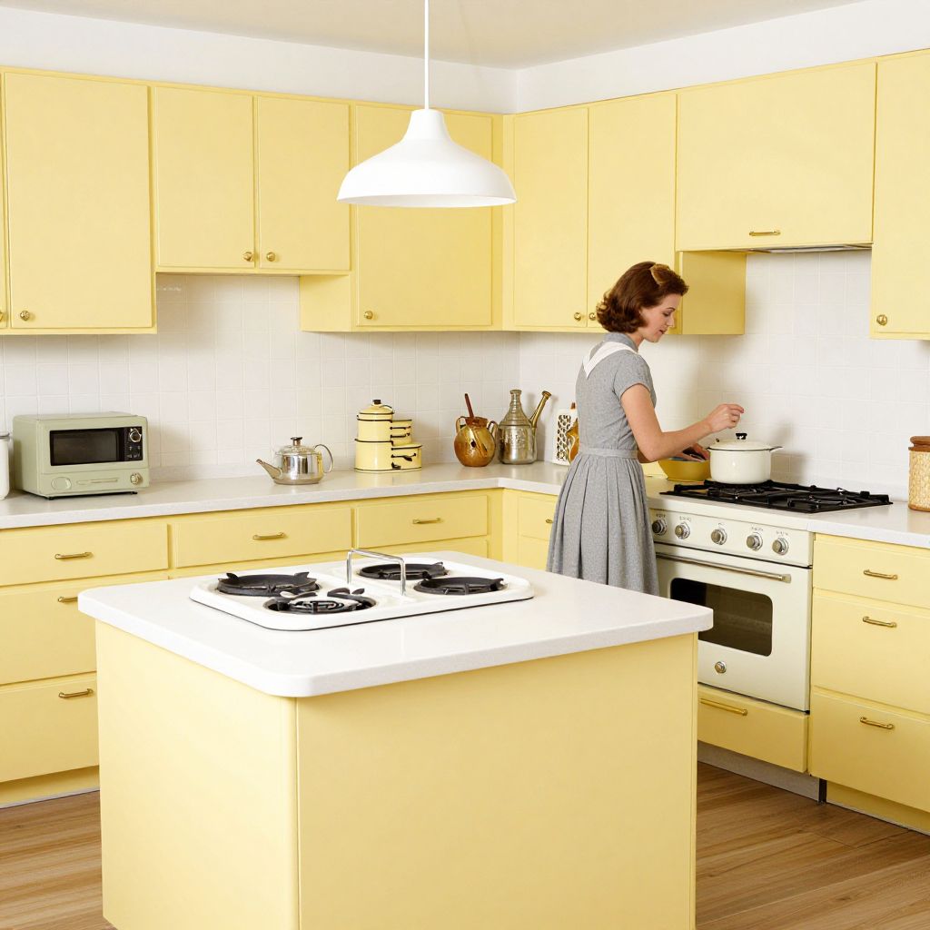 A vibrant mid-century modern illustration showcases a retro 1950s kitchen with pastel yellow cabinets, a central island featuring dual electric burners, and a woman in a gray dress standing near a stove, capturing the nostalgic charm and functionality of the era as depicted in the Better Homes & Gardens Mid-Century Home Style collection.