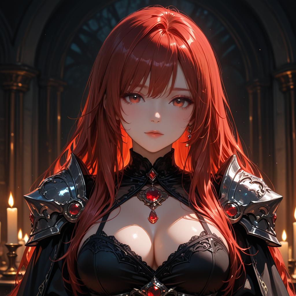 A digital illustration of a red-haired fantasy woman with long hair, medium breasts, and red eyes, wearing a black dress with intricate lace and metal shoulder armor adorned with red gems. She has a pendant necklace with matching red gem and subtle makeup including red lips. The scene is lit by warm candlelight with multiple candles in the background, set within a dimly lit gothic or medieval architectural environment featuring arches.