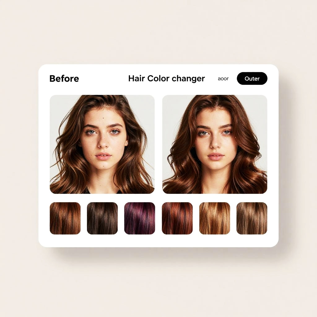 Hair color changer website dashboard, showcasing before and after hair color transformations, side-by-side comparison panels, vivid hair color swatches, minimalistic layout, soft shadows, tech-inspired design with friendly user experience