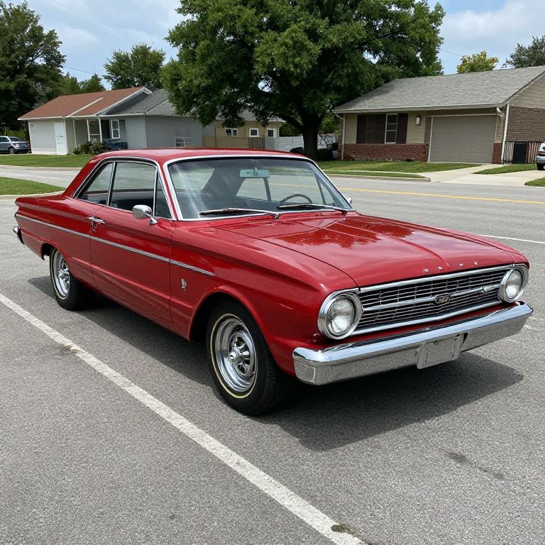 This photograph features a vibrant red, vintage 1960s sedan parked in a suburban street. The car has a shiny chrome grille, round headlights, and a chrome bumper. Its classic design includes a two-door coupe body with silver wheel covers and white-trimmed windows. In the background, there are single-story houses with brown and beige exteriors, surrounded by green lawns and large trees under a blue, partly cloudy sky. The car is positioned diagonally in a white-lined parking space, with the front slightly angled towards the viewer. The texture of the asphalt is visible, adding a realistic touch to the scene.