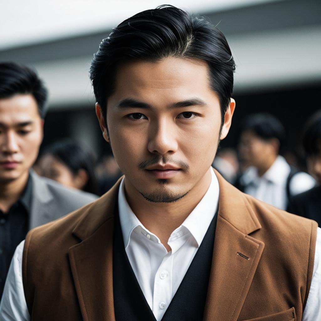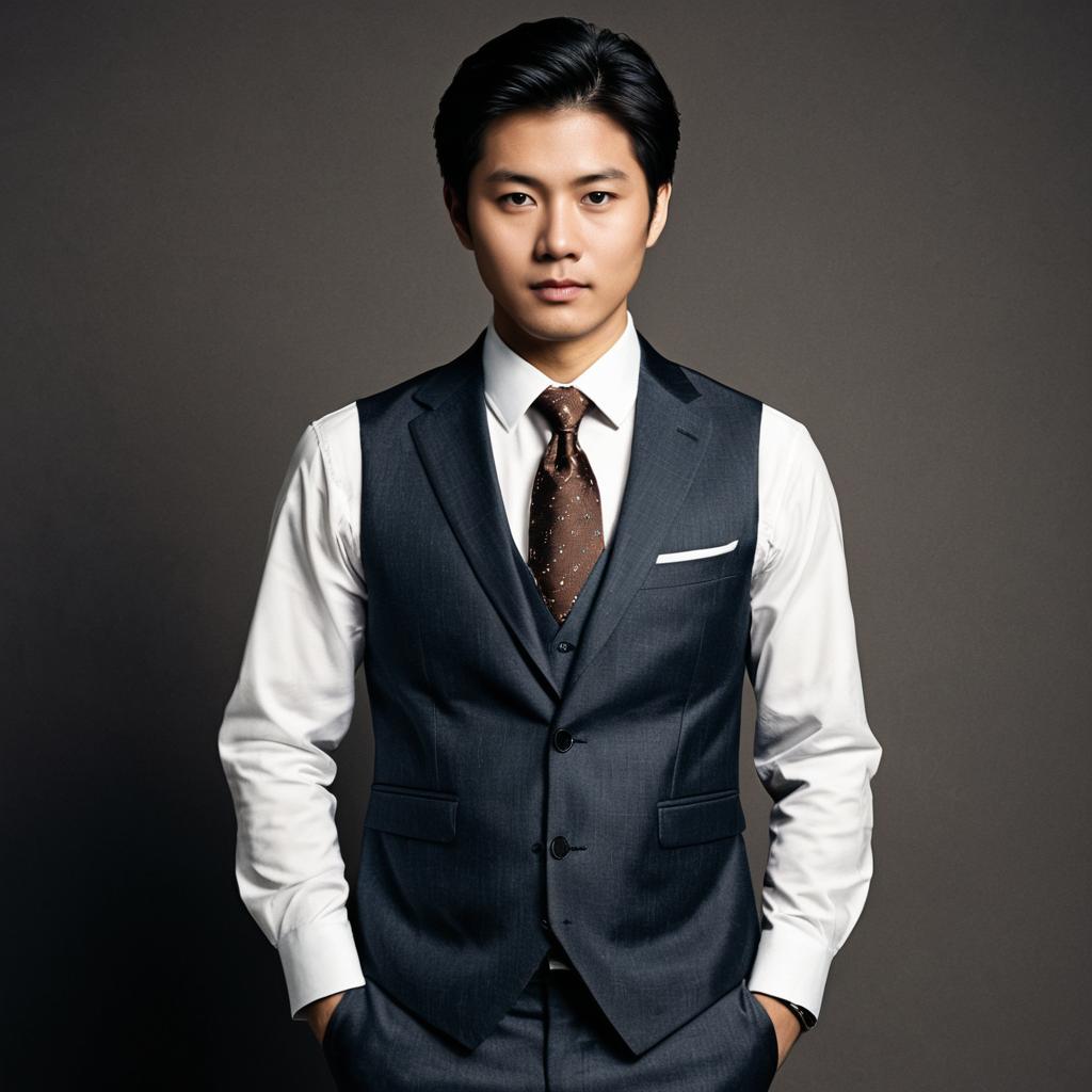 Styles man wear,watch, 1boy, male focus, wristwatch, solo, shirt, realistic, pants, facial hair, collared shirt, closed mouth, looking at viewer, standing, belt, short hair, white shirt, brown hair, black belt, grey pants, asian