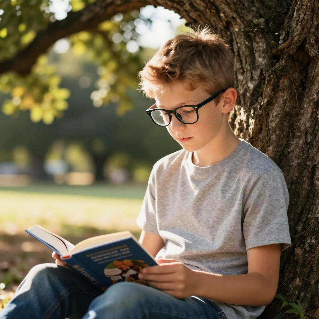 Realistic photo.a boy with glasses and messy hair smiling as he reads to lively goldfish in the aquarium, surrounded by colorful corals with 100mm lens. realistic photo