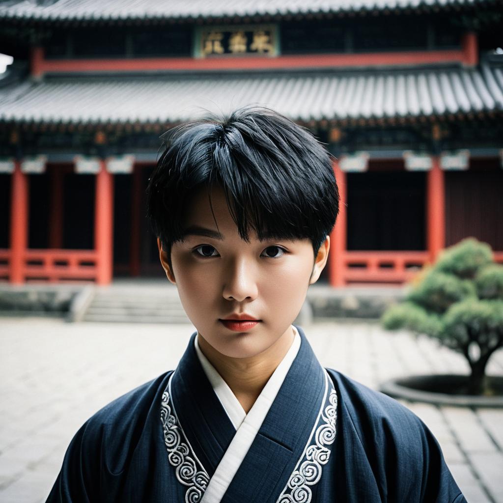 Portrait of an East Asian young man wearing traditional dark blue Asian clothing with white embroidered details. He has short black hair, black eyes, and a serene expression. The background shows a traditional East Asian architectural setting with red pillars and tiled roofs, suggesting a historical or cultural site.