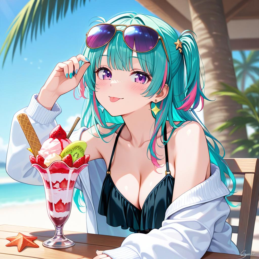 1girl, solo, tongue out, ice cream, long hair, tongue, pink hair, eyewear on head, jewelry, earrings, multicolored hair, frills, food, jacket, bangs, blue eyes, off shoulder, long sleeves, looking at viewer, arm up, nail polish, upper body, sunglasses, swimsuit, blue nails, frilled bikini, bare shoulders, white jacket, bikini, black bikini, open clothes, open jacket, multicolored eyes, streaked hair, :p, two-tone hair, purple eyes, signature, shell, cup, two side up, blue hair, collarbone, starfish, aqua hair, blurry, table, parfait, closed mouth, sundae, blush, aqua nails, character name, ice cream cone, seashell, palm tree, green hair, glass, multicolored nails, facial mark, star \(symbol\), artist name, hand up, fruit, spoon, sleeves past wrists