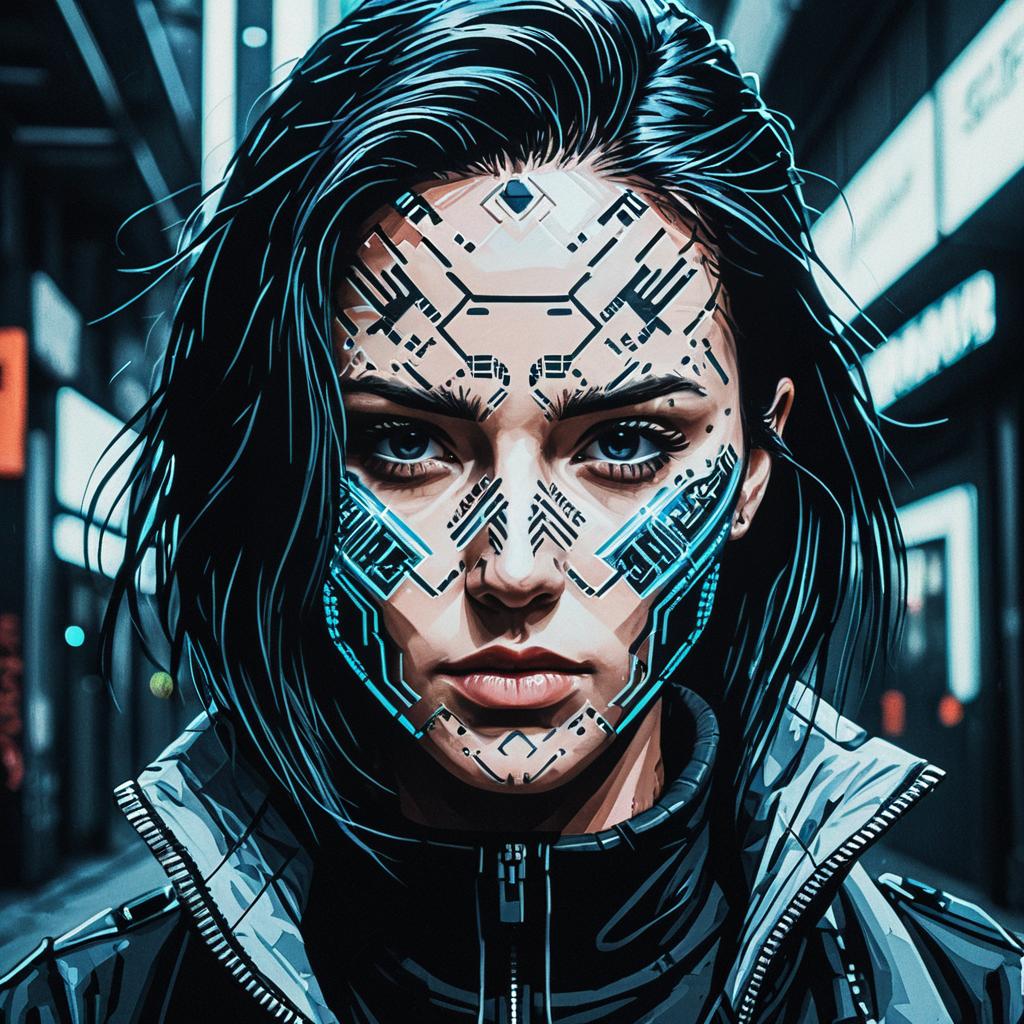 Digital pixel art portrait of a cybernetic female street artist with circuit-like facial tattoos and glowing blue accents. The subject has blue eyes, medium-length dark hair, and wears a futuristic jacket with reflective details. The image features a cyberpunk style and an urban night street background.