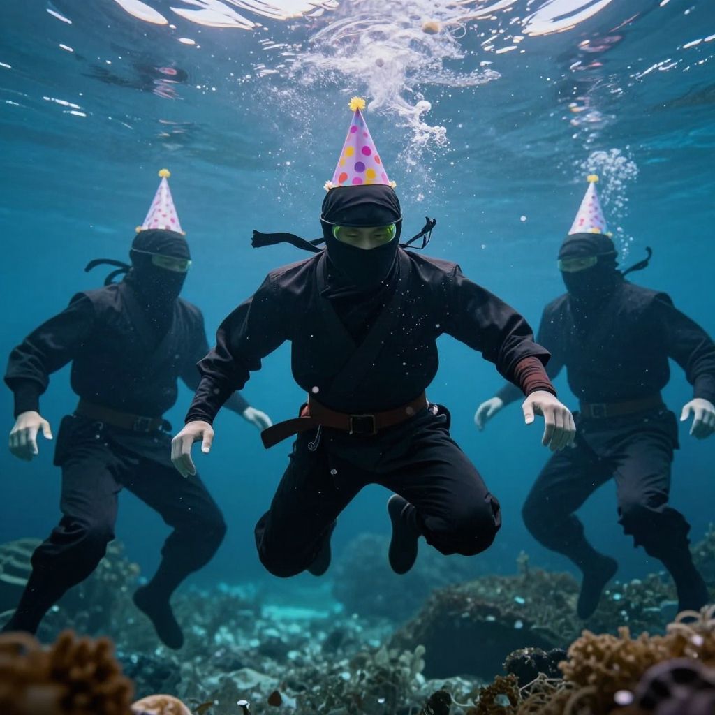 Ninja party underwater, (underwater: 1), hyperrealism, photorealism, cinematic, full body, (birthday hats: 1)
