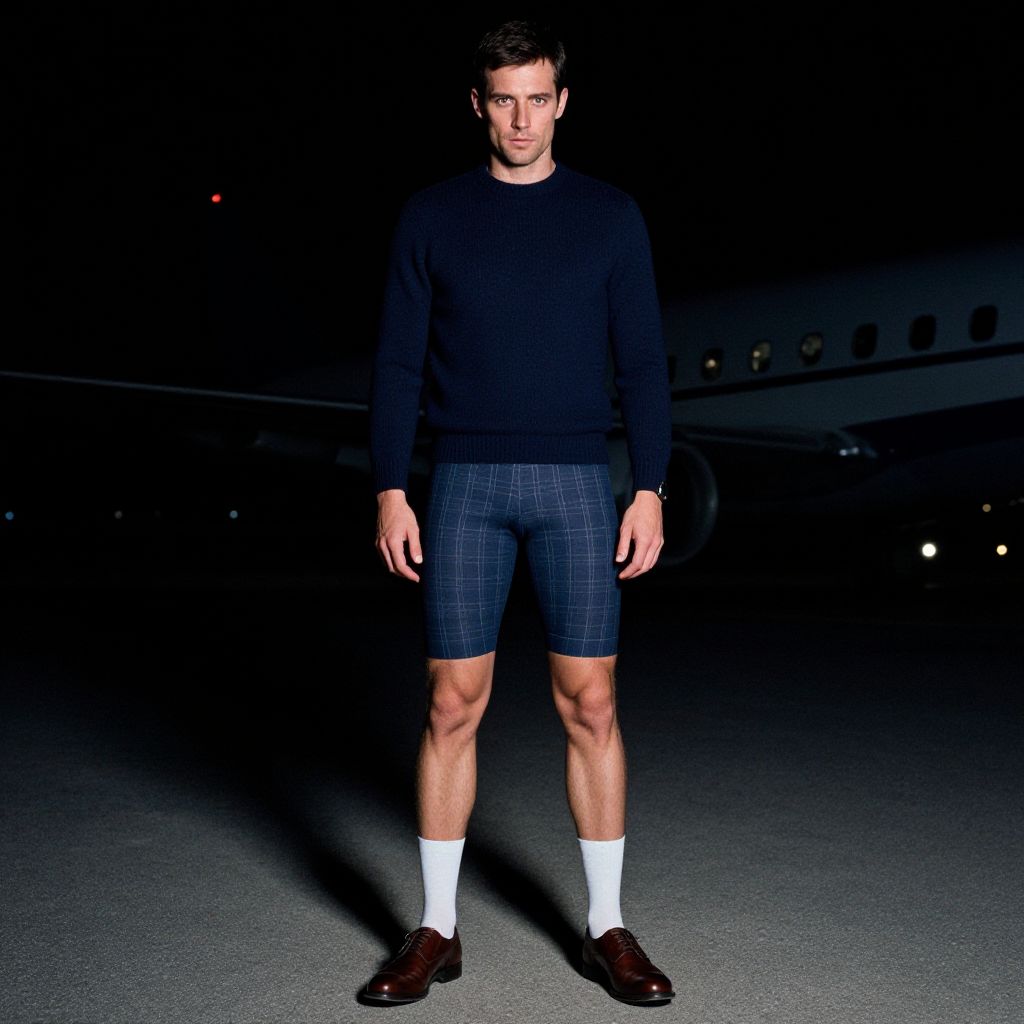 A man, navy blue merino wool cycling sweater, tailored plaid cycling shorts, classic leather saddle shoes, nighttime glow of floodlights, sleek aircraft silhouettes, ib technicolor film stock, focused expression Man has masculine face and piercing eyes