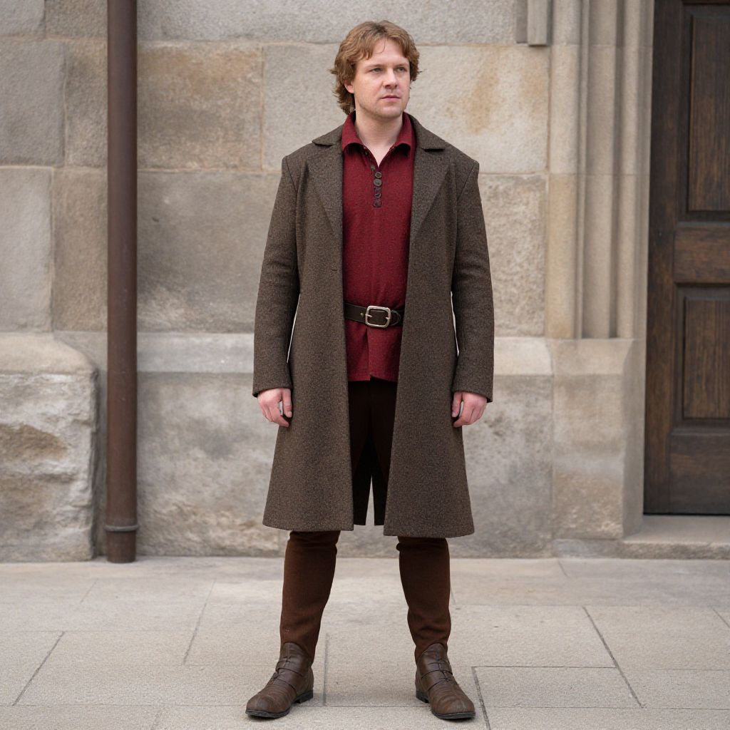 A man in a medieval costume is standing on a sidewalk. He is wearing a brown coat with a red shirt underneath.