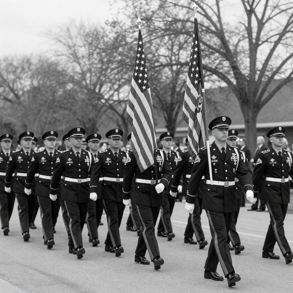 Black-and-White Military Parade with Flags
