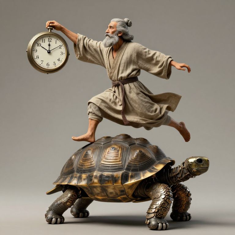 In a surreal dance of time and motion, an ancient philosopher races atop a mechanical tortoise, clutching a reversed clock that defies the relentless march of time, embodying the paradoxical pursuit of serenity amidst the urgency of existence.