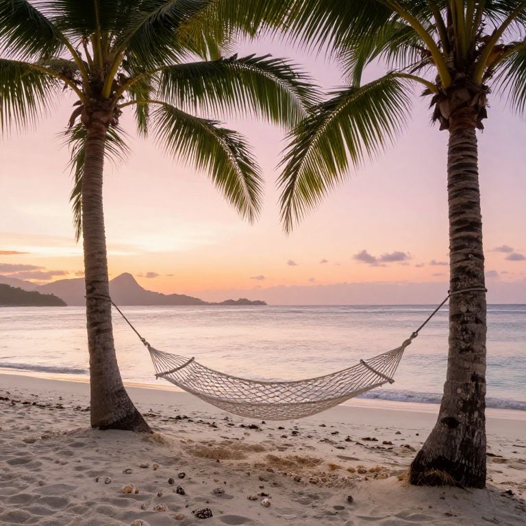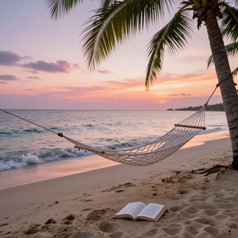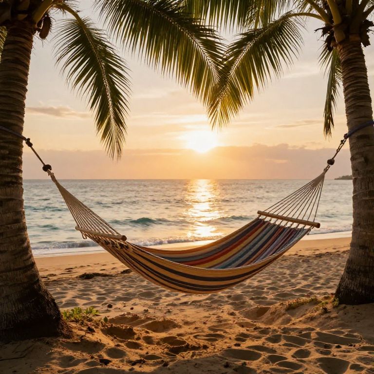 Unwind on a tropical beach with crystal clear turquoise water, soft white sand, and palm trees swaying gently in the breeze, a colorful hammock hanging between two palms, bright sunny sky, vibrant blue ocean waves, peaceful and rejuvenating mood.