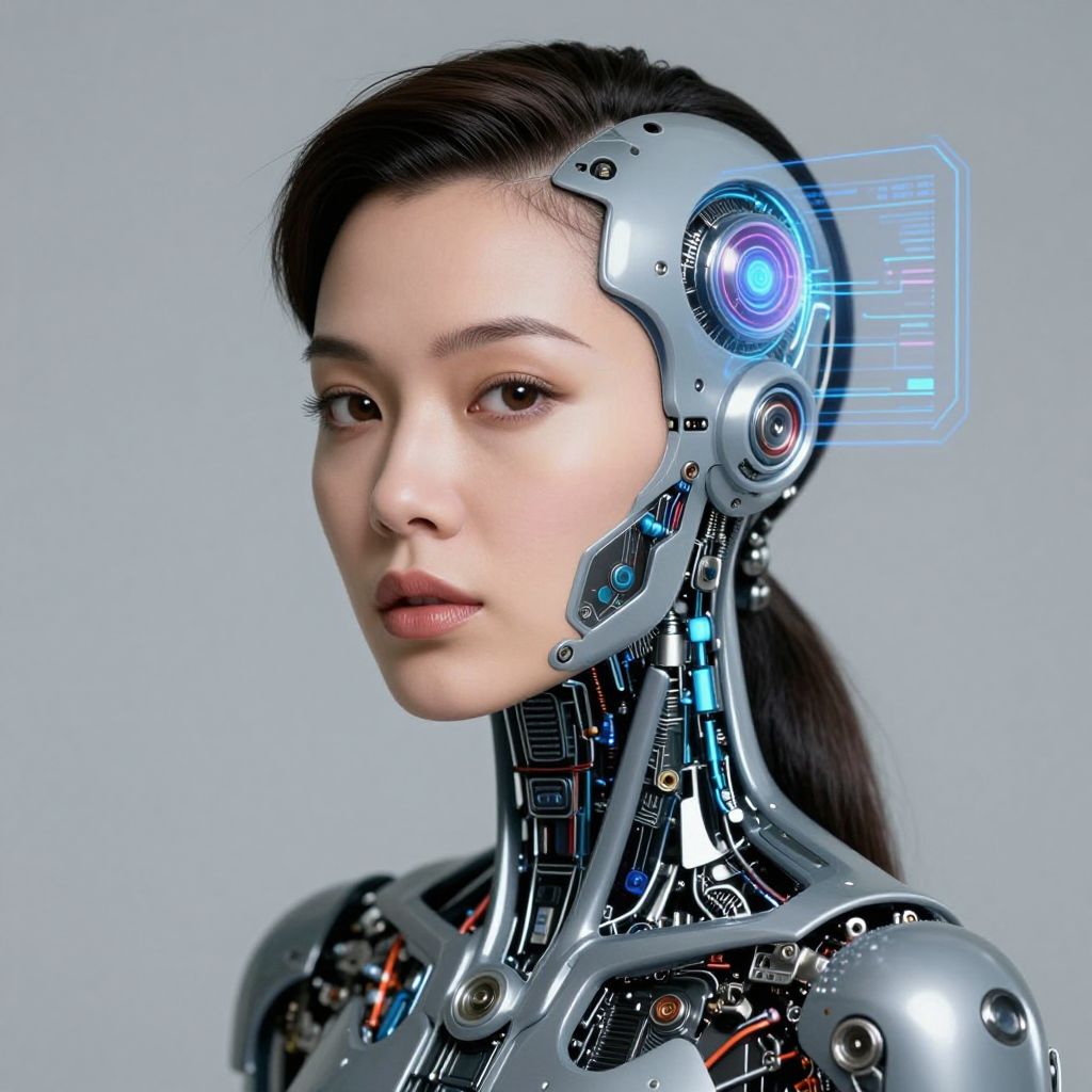 Photorealistic CGI of a cybernetic woman with pale skin, dark hair in a bun, and a futuristic robotic head and neck. Blue holog