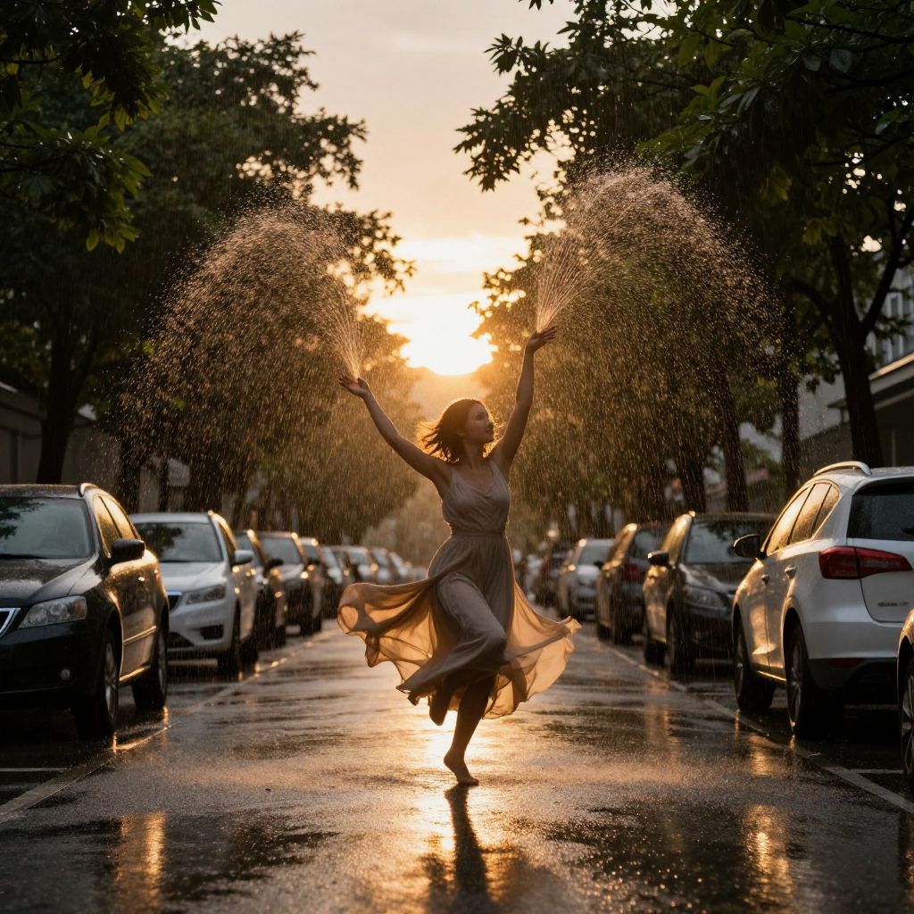 A woman in a flowing dress dances down a wet street at golden hour, as raindrops ascend skyward in synchronized motion, leaving glowing trails that shimmer like tangible aspirations against the backdrop of parked cars and leafy trees.