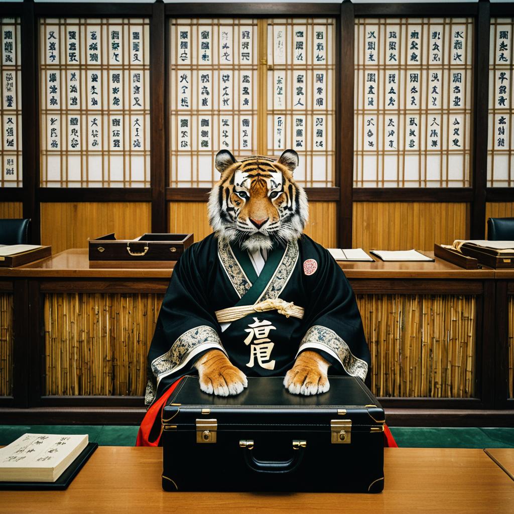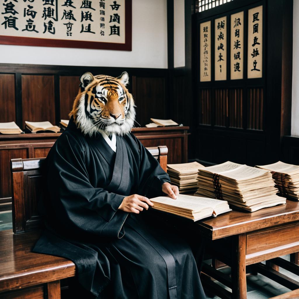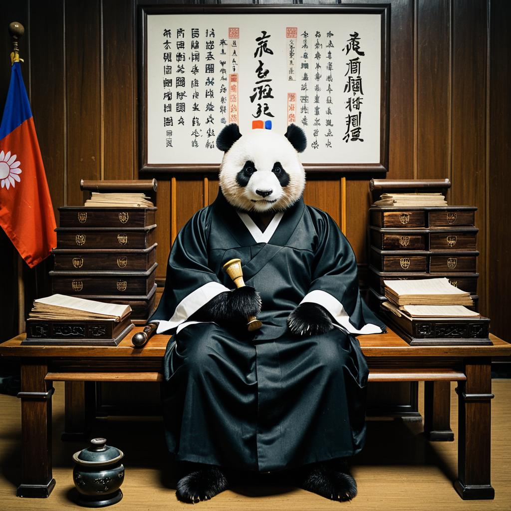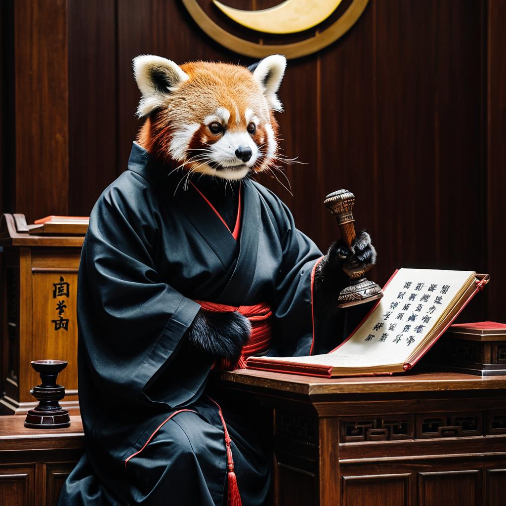 A red panda wearing a traditional Taiwanese lawyer's robe and presiding over a legal case in a Taiwanese courtroom. The red panda holds a wooden gavel and sits beside an ancient Taiwanese legal scroll adorned with traditional Chinese script. The background includes Taiwanese sun-moon emblem shining subtly and lacquered mahogany courtroom podium. The atmosphere is solemn and traditionally Taiwanese.
