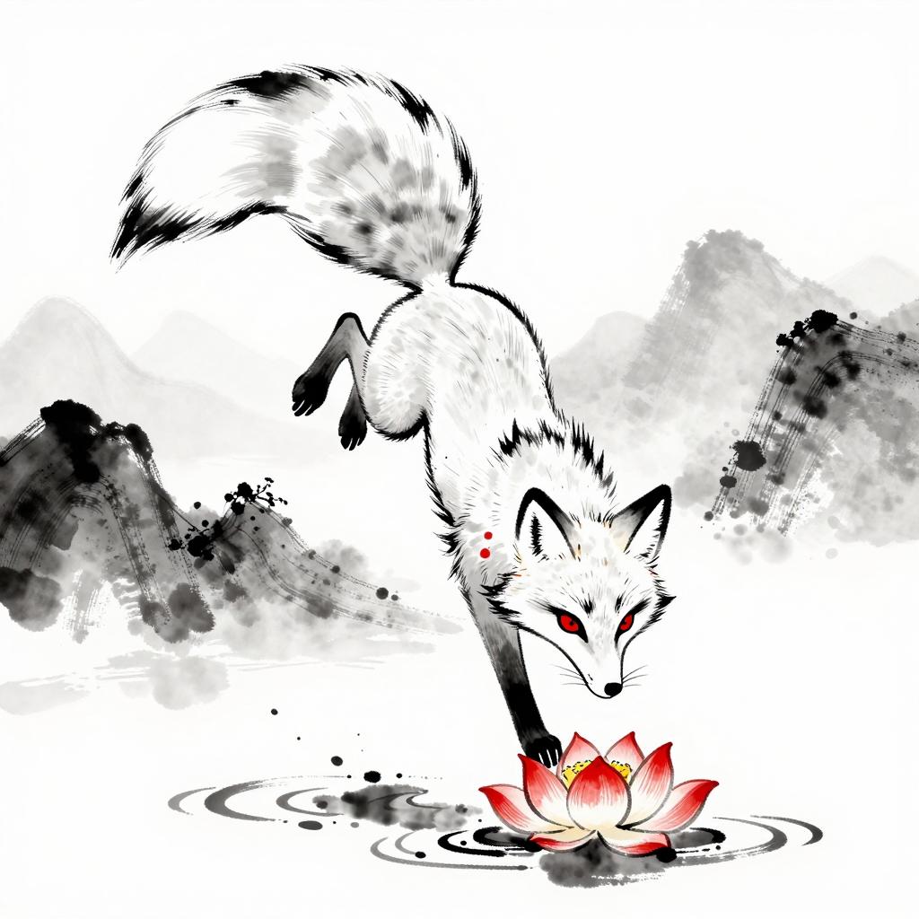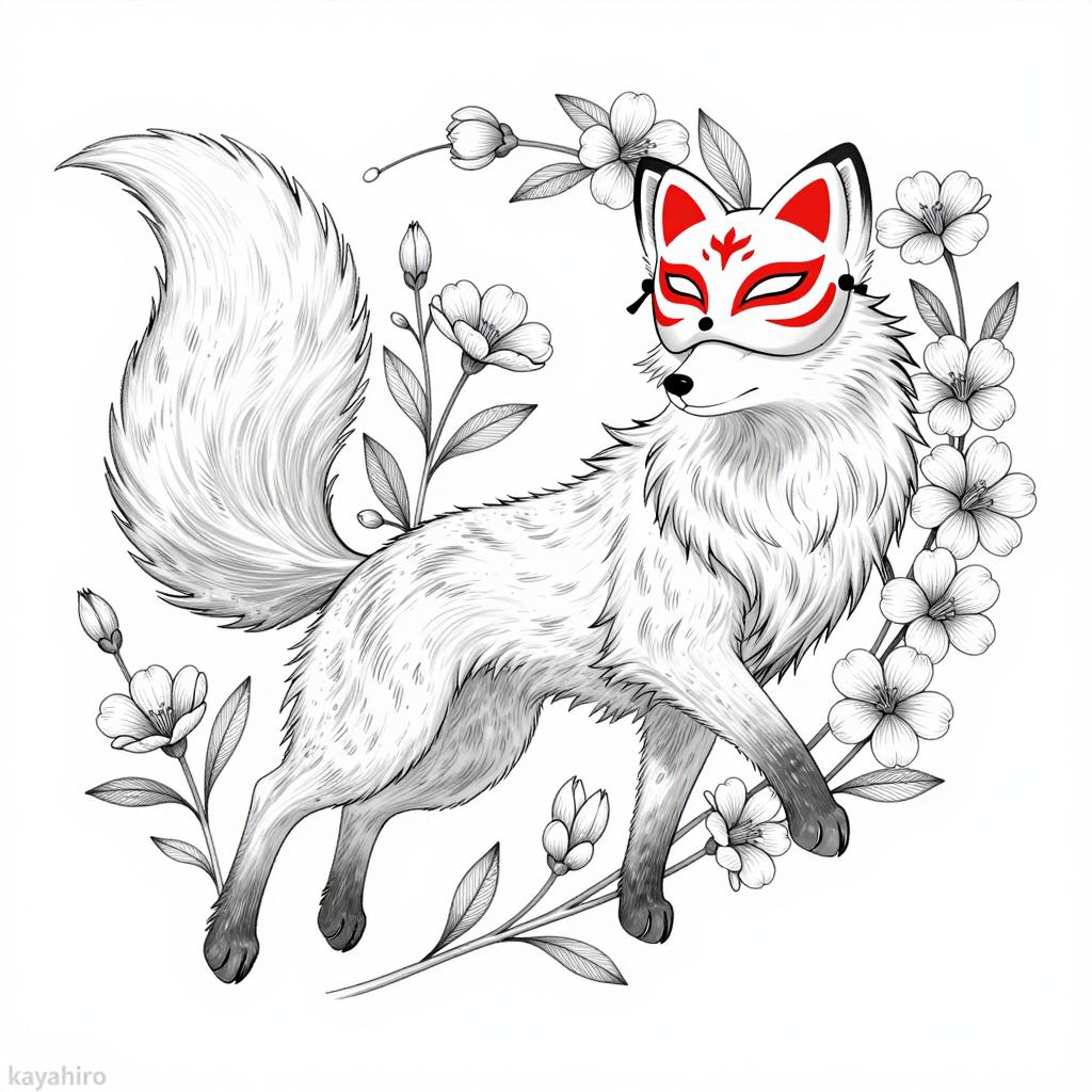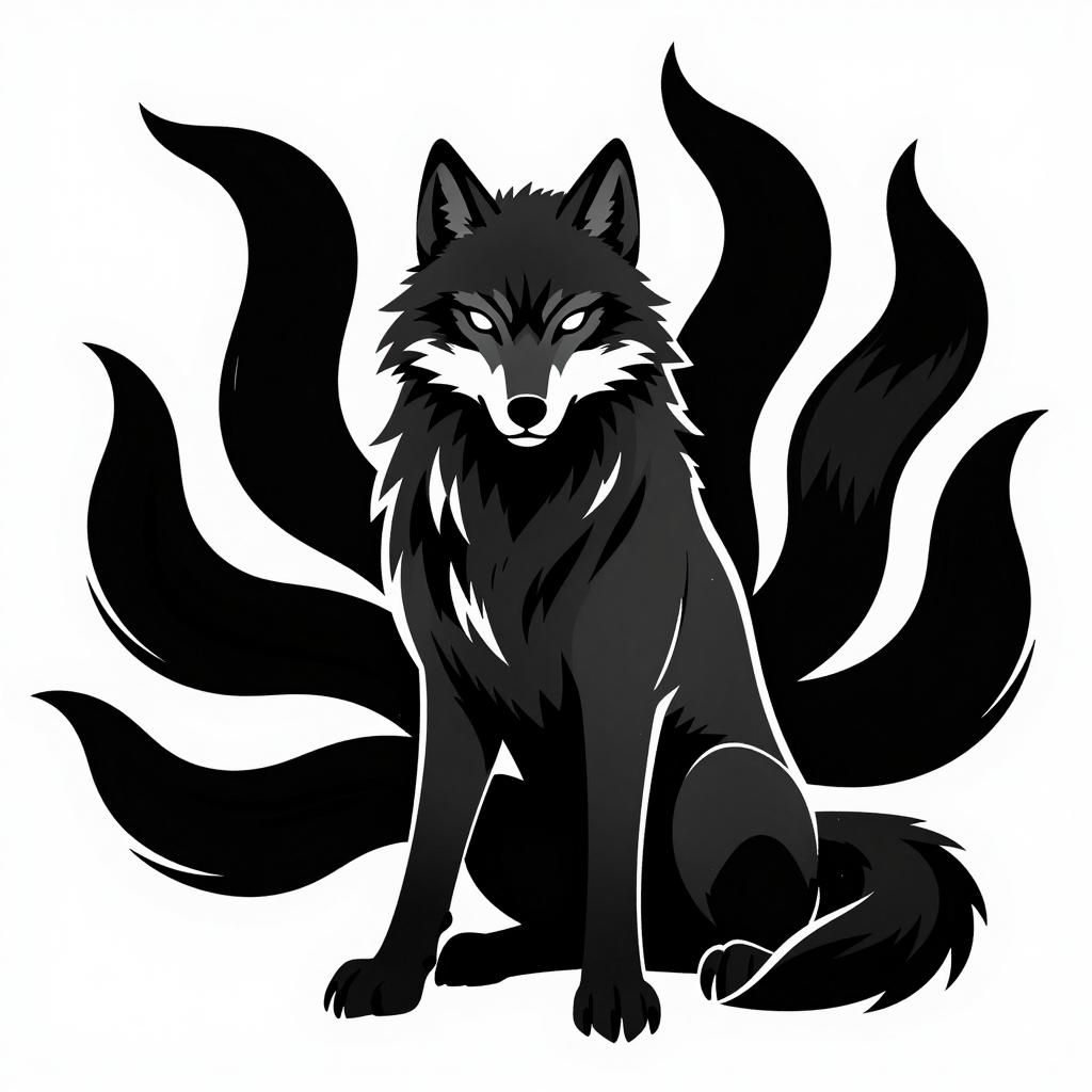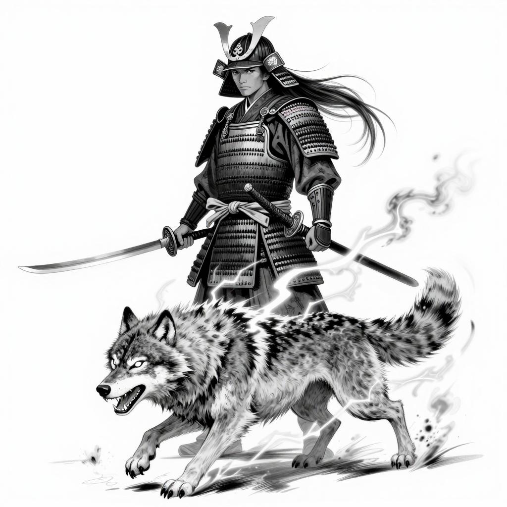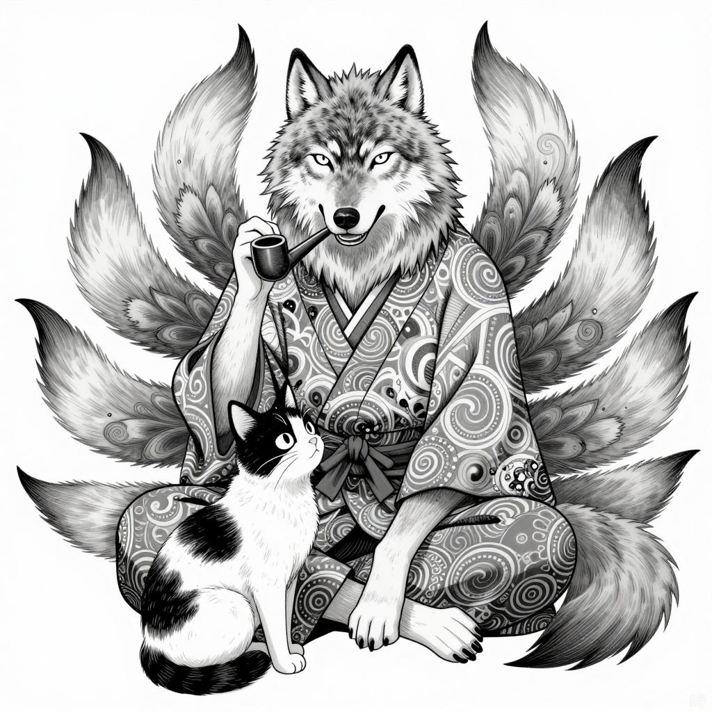 Illustration of an anthropomorphic wolf in mid-leap. Wolf wears a skull on its head, a patterned kimono, and a wrapped obi. Wolf has a fierce expression, sharp teeth, and raised paws. Long, bushy tail flows behind. Black and white ink drawing. Wolf's body is twisted, right leg raised higher than left. Background is plain white.