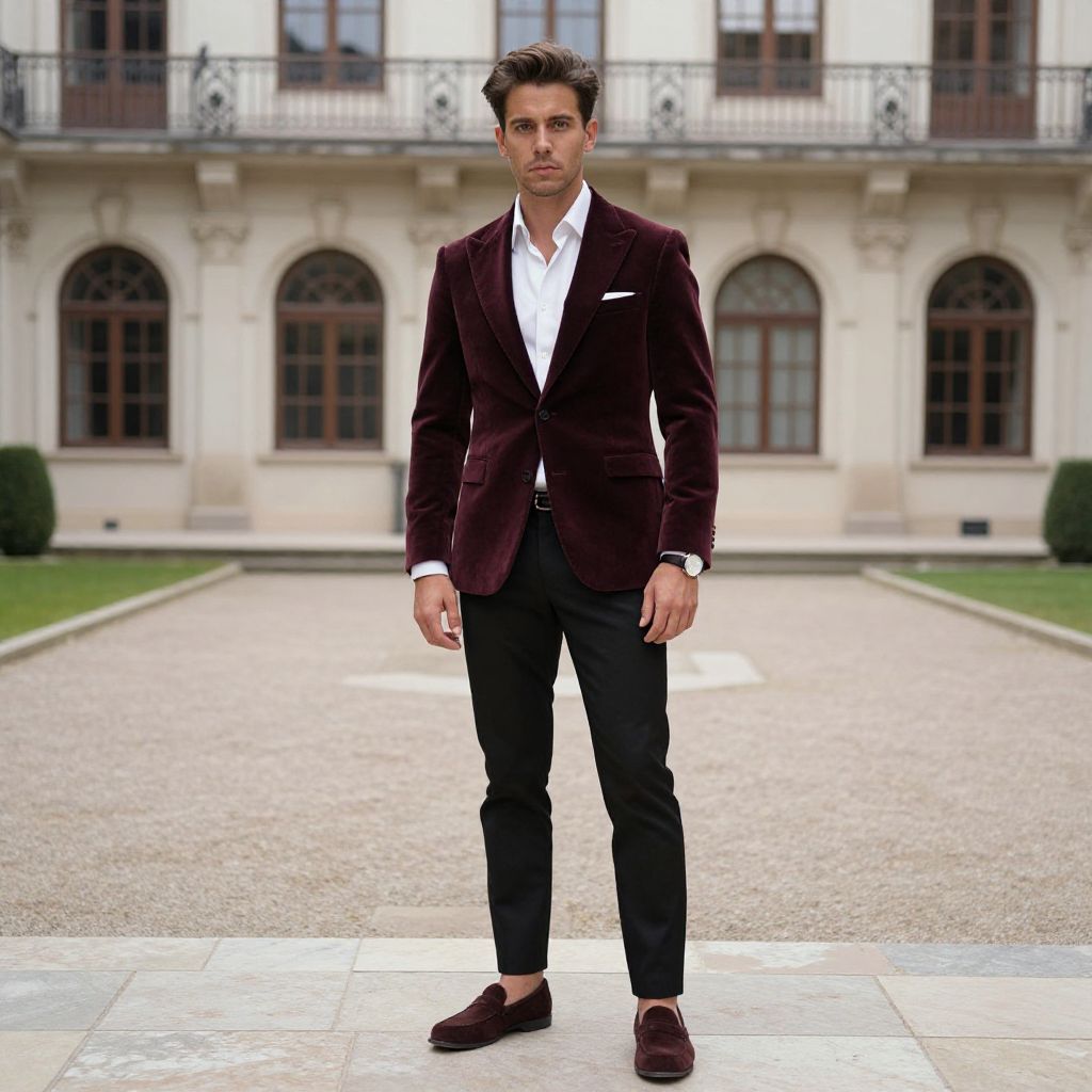A man, burgundy velvet blazer, crisp white dress shirt, slim-fit black chinos, luxurious suede loafers, elegant leather wristwatch, historic building, ornate architecture, tranquil courtyard, medium format film, confident expression. Man has masculine face and piercing eyes