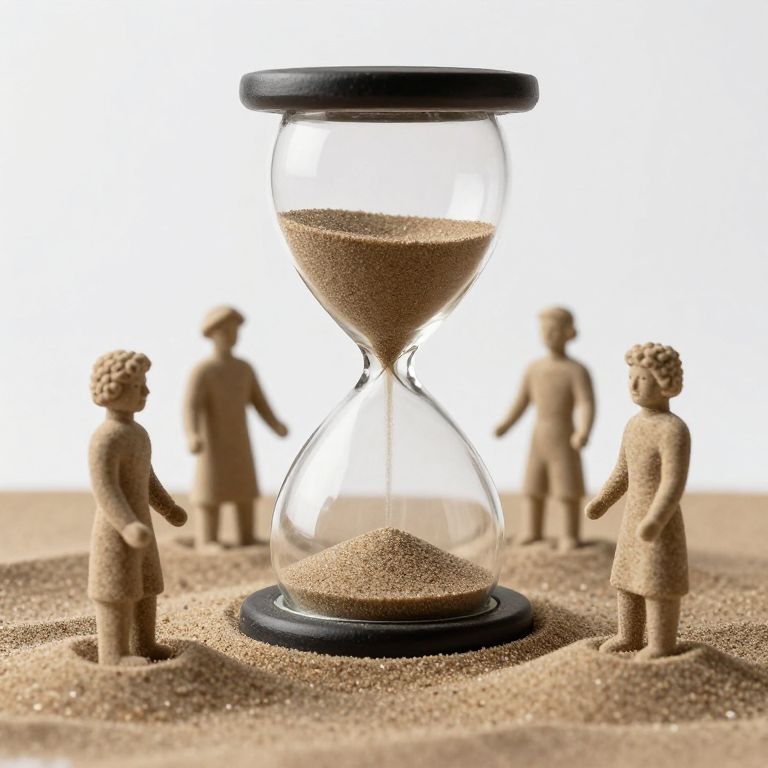 Photograph of a clear glass hourglass with a black top and bottom, filled with beige sand. The hourglass stands on a surface covered in the same beige sand. Surrounding the hourglass are four small, sand-colored, human figurines with curly hair, standing in a semi-circle. The background is a plain white, emphasizing the hourglass and figurines. The sand in the hourglass is mid-flow, with a visible pile at the bottom and a smaller pile at the top. The figurines have simple, stylized features. The overall composition suggests themes of time and human passage.
