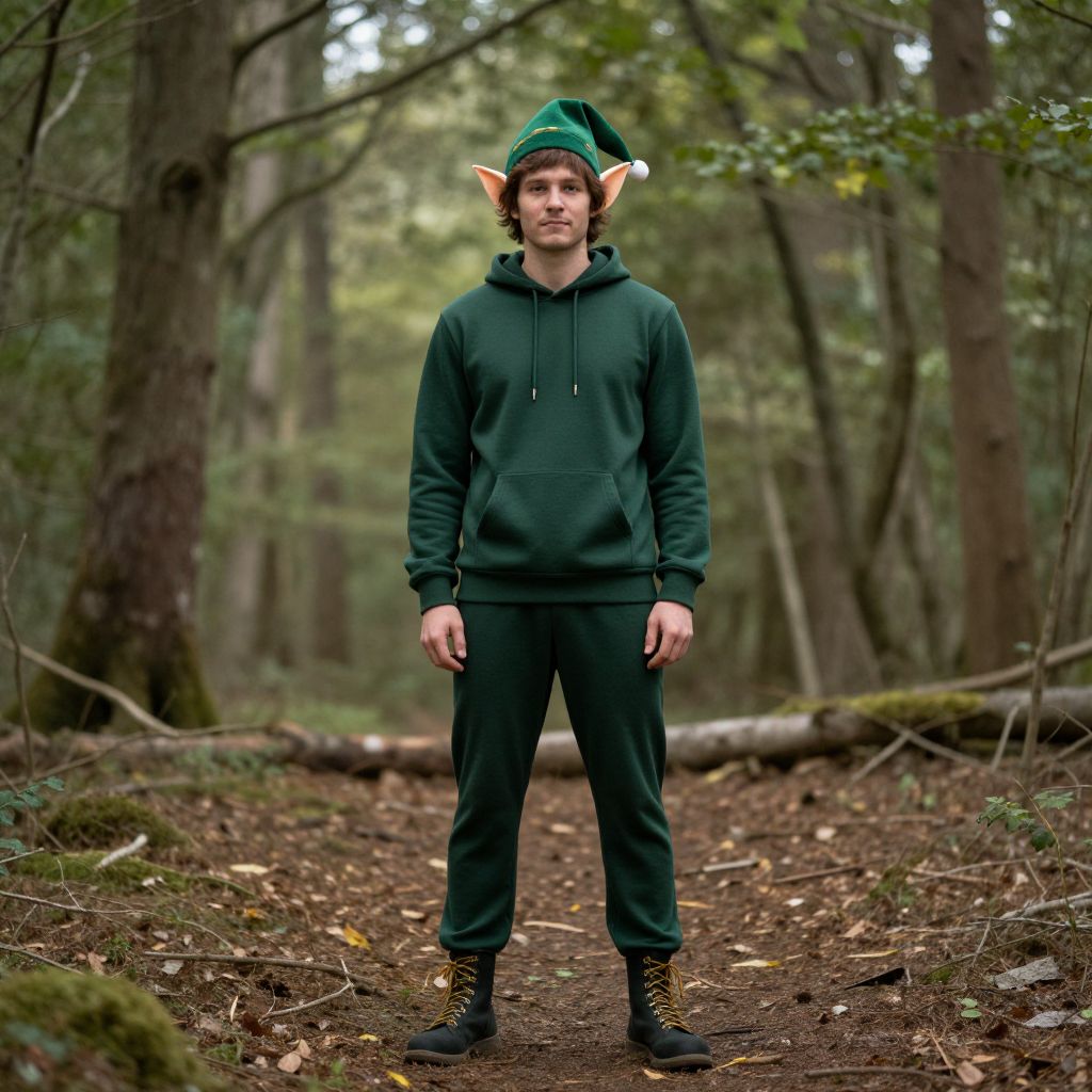 A photograph of a young man standing in a forest path. He wears a dark green hooded sweatshirt, matching green pants, and black lace-up boots. His head is adorned with a green elf hat with pointed ears. He has fair skin, brown curly hair, and a slight beard. The forest background features tall trees with green foliage, a dirt path, and scattered leaves and twigs on the ground. The lighting is natural, with a slightly overcast sky, creating a soft, diffused light. The man stands centrally, facing the camera with a neutral expression.