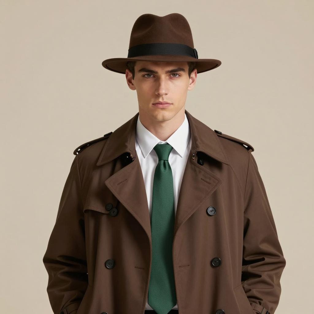 Jojo costume seussical, photograph of a young man, standing, hands in pockets, wearing a dark gray leather jacket, light blue dress shirt, black tie, black pants, red and white striped top hat with a large red fluffy brim, orange gradient background, serious expression, casual pose, sharp contrast, modern street style, whimsical hat, bright colors, medium shot, portrait orientation