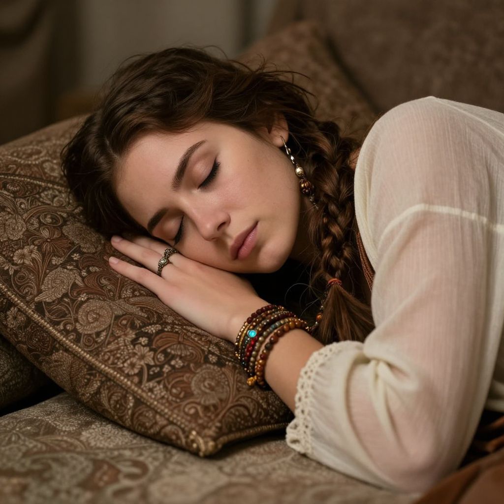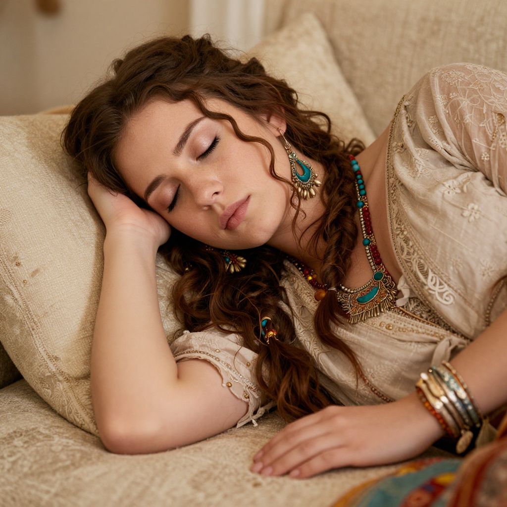 Photograph of a young woman with long, wavy brown hair, light skin, and closed eyes, resting her head on a cream-colored pillow. She wears a beige, embroidered blouse, turquoise earrings, a matching necklace, and multiple bracelets on her right wrist. Her serene expression and relaxed posture suggest she is asleep. The background includes a beige sofa with a subtle pattern, and a colorful, patterned blanket is partially visible on the right. The lighting is soft, enhancing the warm, tranquil atmosphere of the scene.
