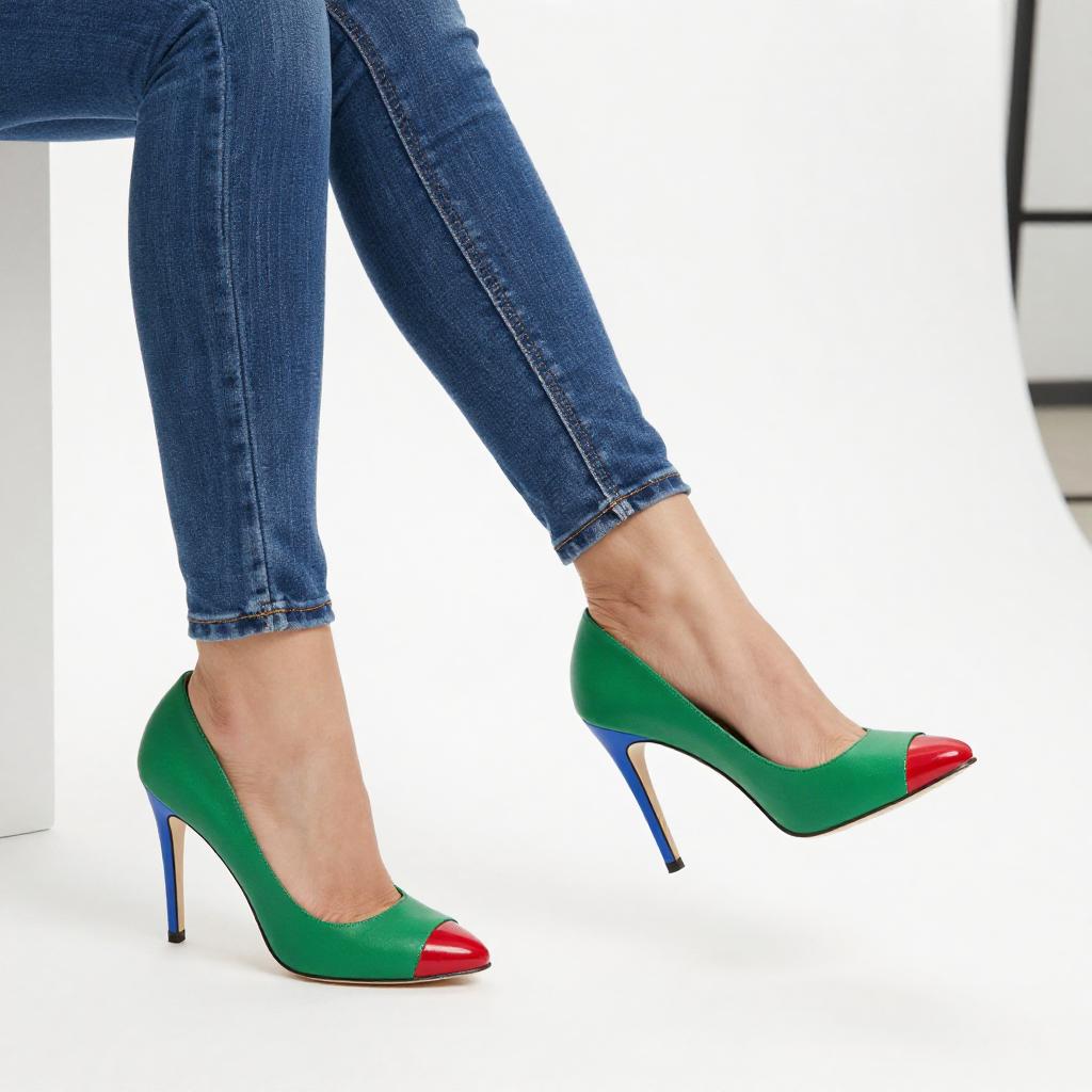 Photograph of five pairs of women's high heels lined up horizontally on a white background. The heels include silver platform sandals, red patent leather pumps, blue patent leather pumps, and black leather pumps. The legs of a person wearing the silver sandals are visible from the knees down. Lighting is bright and even, with a shallow depth of field that keeps the heels in sharp focus while the background is blurred. Camera angle is straight-on.