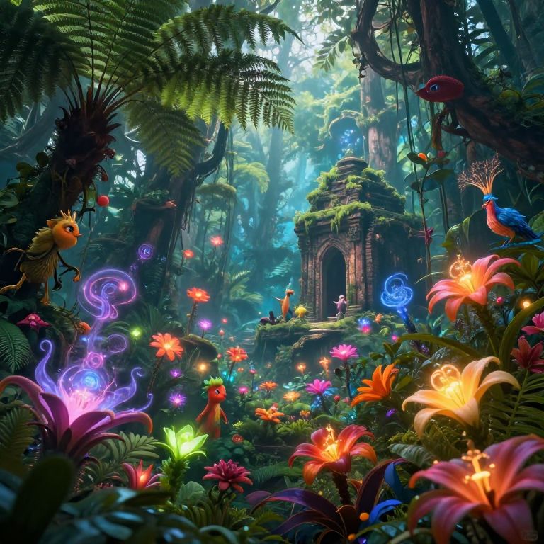 Magical forest images of a vibrant enchanted jungle alive with glowing exotic flowers, swirling magical energies visible in the air, colorful mythical creatures peeking from behind giant ferns, and ancient ruins partially overtaken by nature, all bathed in a soft mystical glow.