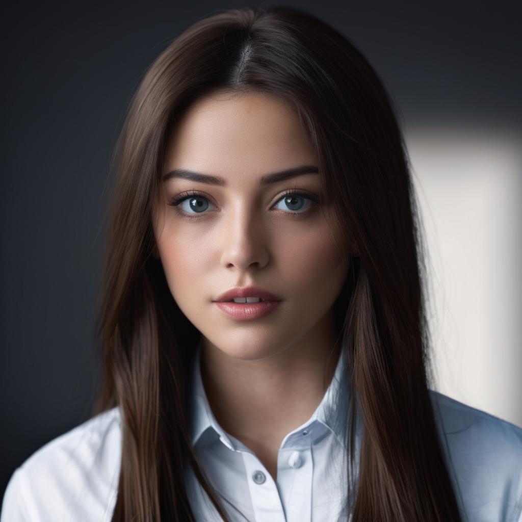 Close-up portrait of a young woman with smooth dark skin, long dark hair, striking blue eyes, and natural makeup, wearing a light blue collared shirt. The background is softly blurred, emphasizing her facial features and confident expression.
