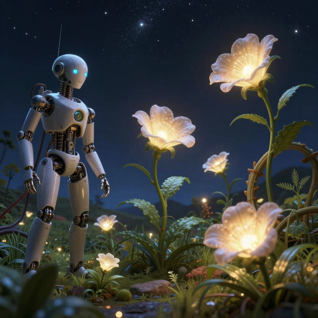 Photorealistic CGI: Glowing white robot with blue eyes stands among luminescent flowers under a starry night sky, surrounded by lush greenery