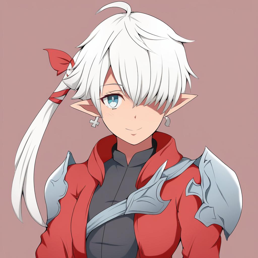 Alisaie leveilleur, final fantasy, 1girl, blue eyes, hair over one eye, white hair, long hair, ahoge, ponytail, hair ribbon, red jacket, earrings, elezen, by artist suwaneko, leet