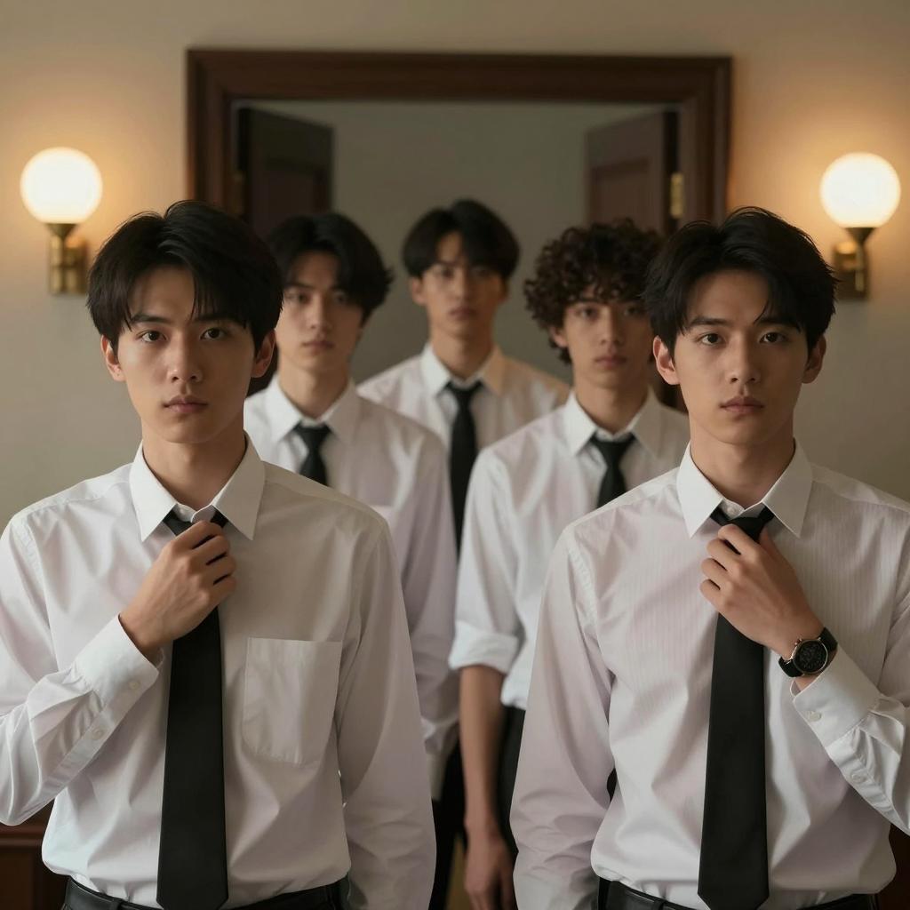 Five men in a dimly lit room. Four in the background wear white shirts and black ties, one adjusting his tie. Man in foreground on the right wears a white striped shirt, holding his collar. Dark-haired men, one with short hair, one with curly hair. Background has a dark doorway and illuminated round bulbs. Men have serious expressions.